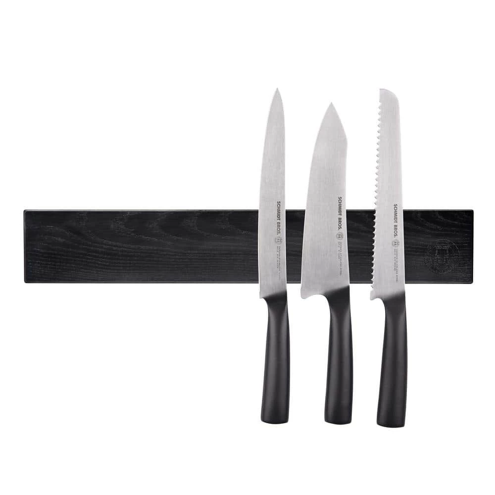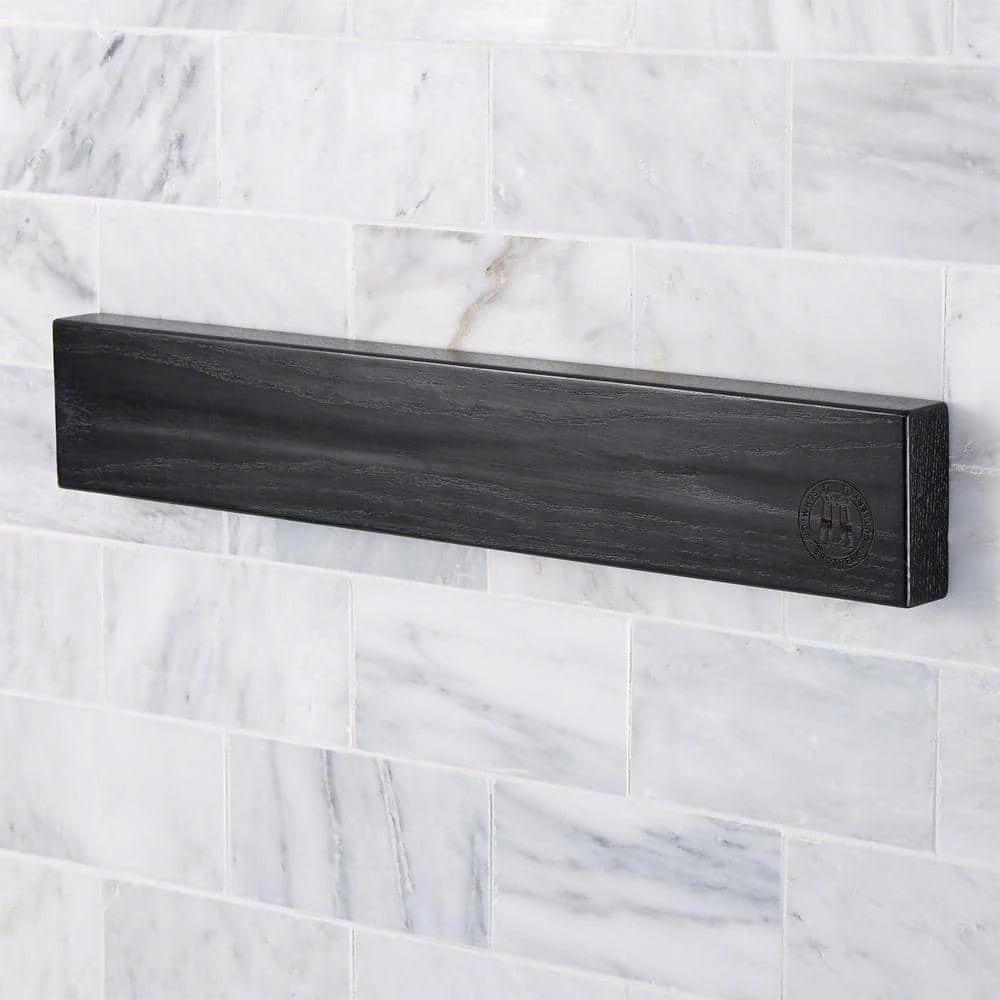 Ultra convenience in cutlery storage. There’s nothing simpler than the concept of this compact knife holder: just attach it to a wall, and the strong magnet grips a wide range of knives in all shapes and sizes, keeping them within easy reach while freeing up precious drawer and counter space. Ebony stained Red Oak construction adds elegance to any kitchen.