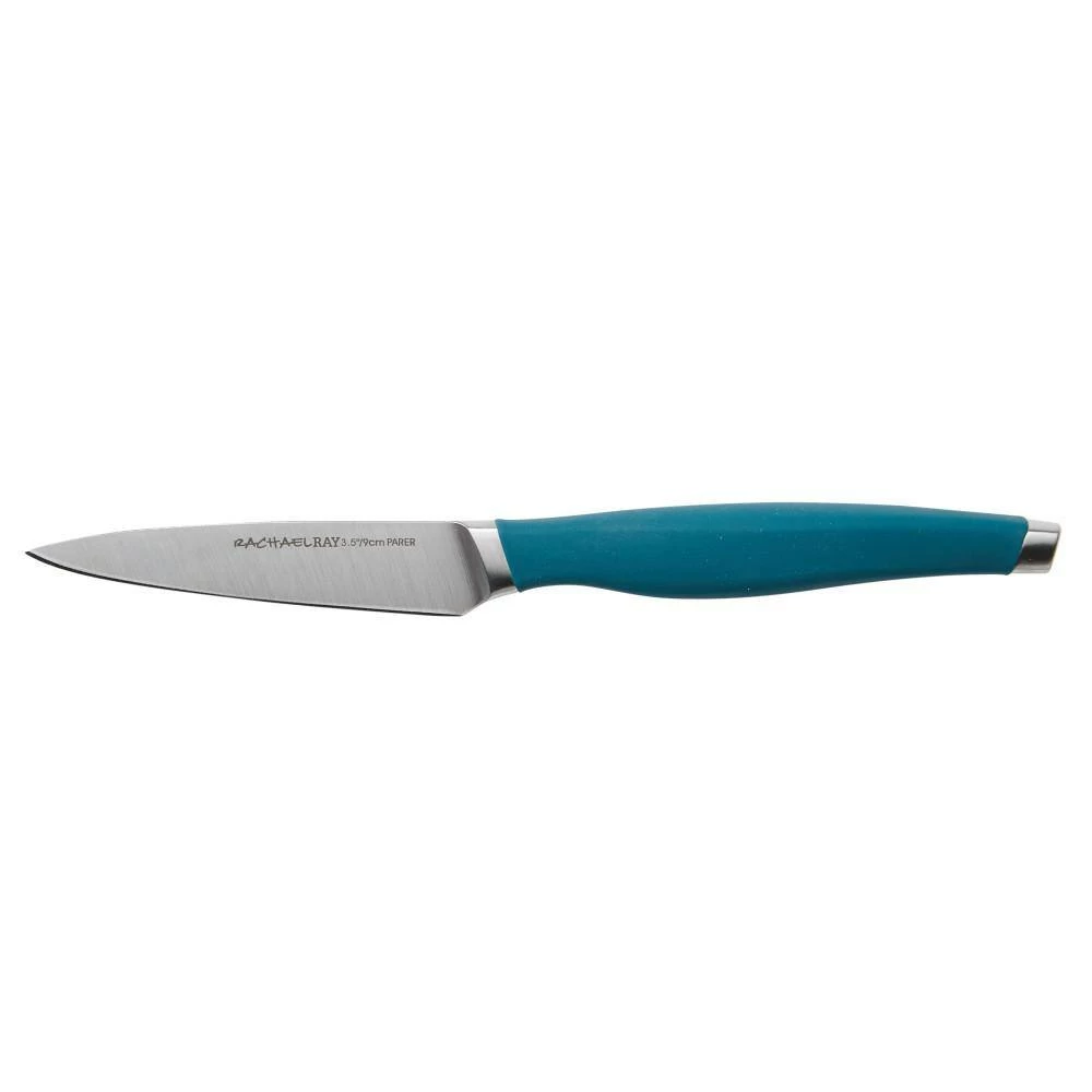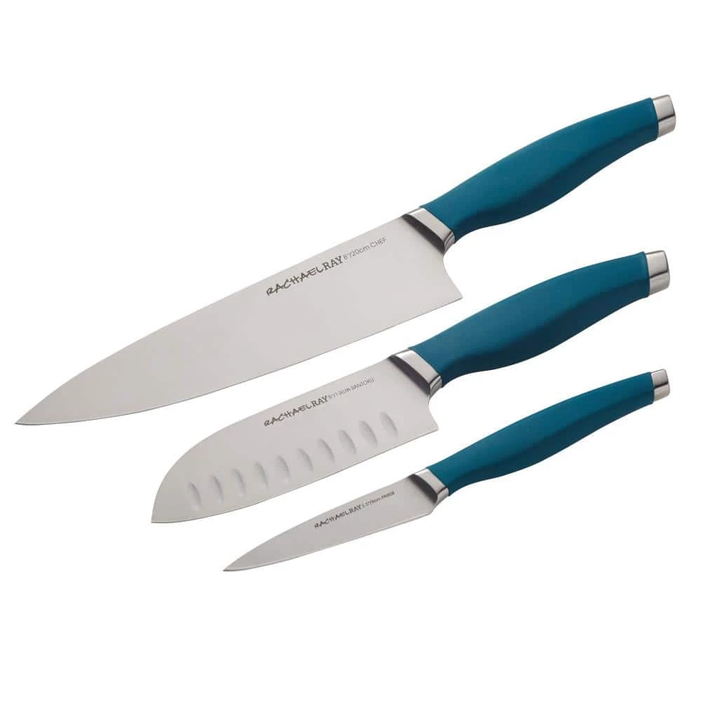 Prepping family-size meals is quicker and easier with the 3-piece Rachael Ray Cutlery Chef Knife set. This set of knives features a chef knife, santoku knife, and paring knife made from premium quality Japanese stainless steel for long-lasting, razor sharp performance. The knives’ comfortable handles are contoured for a comfortable grip when cutting and feature colorful, rubberized grips for a solid, confident hold. Each knife comes with a protective sheath to preserve the blade when storing. Hand-wash recommended to preserve knife performance.