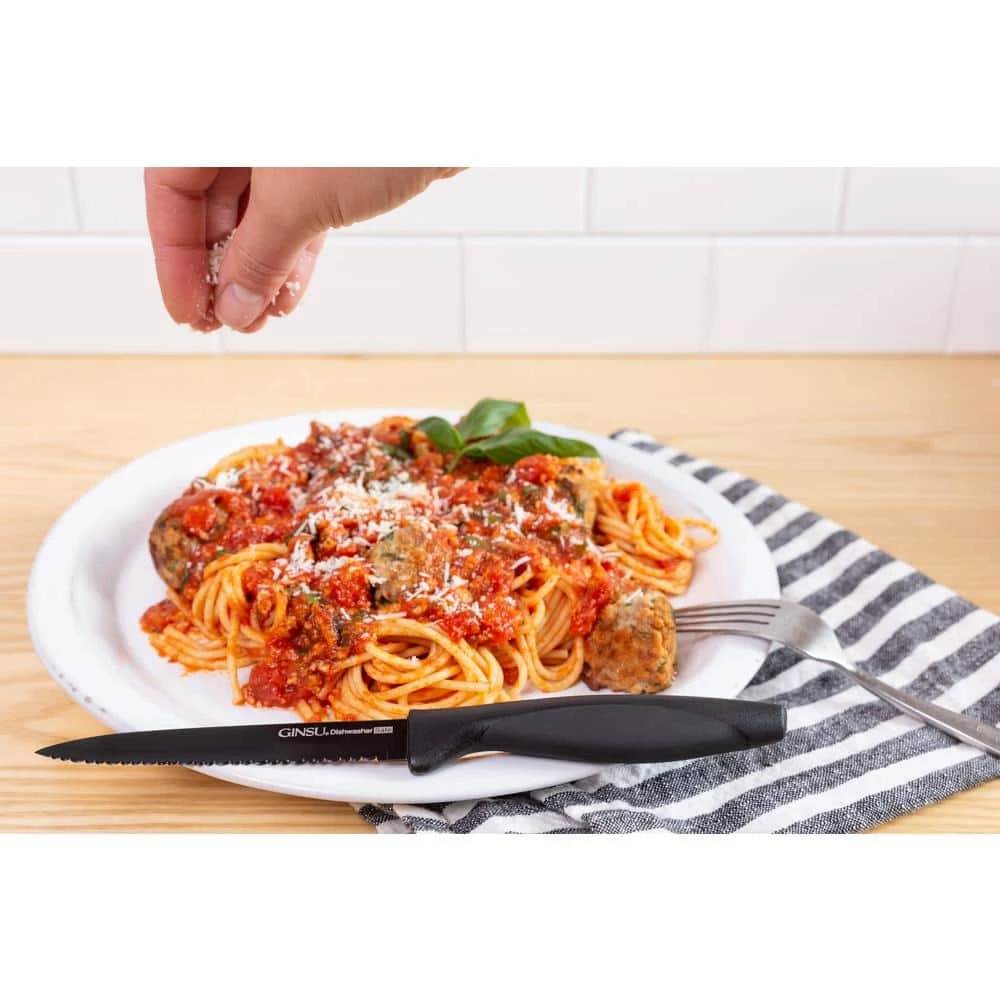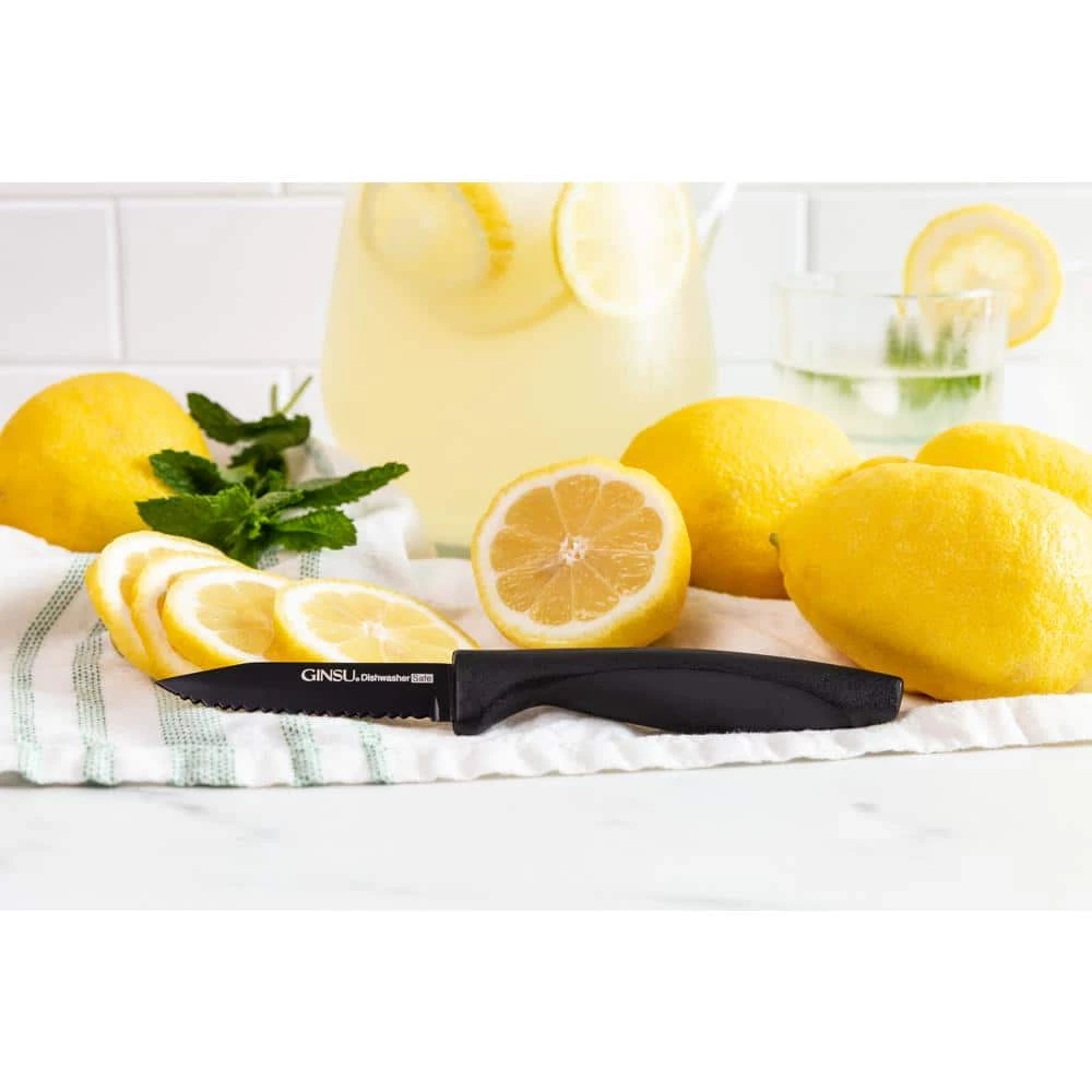 The Daku series is elegantly designed for long-lasting no-maintenance use. Never need sharpening. These Ginsu Daku series knives utilize Ginsu’s double serration design to provide an ultra-sharp blade to reliably cut through anything. Black ceramic coated blades won’t chip or fade and are 100% dishwasher safe.