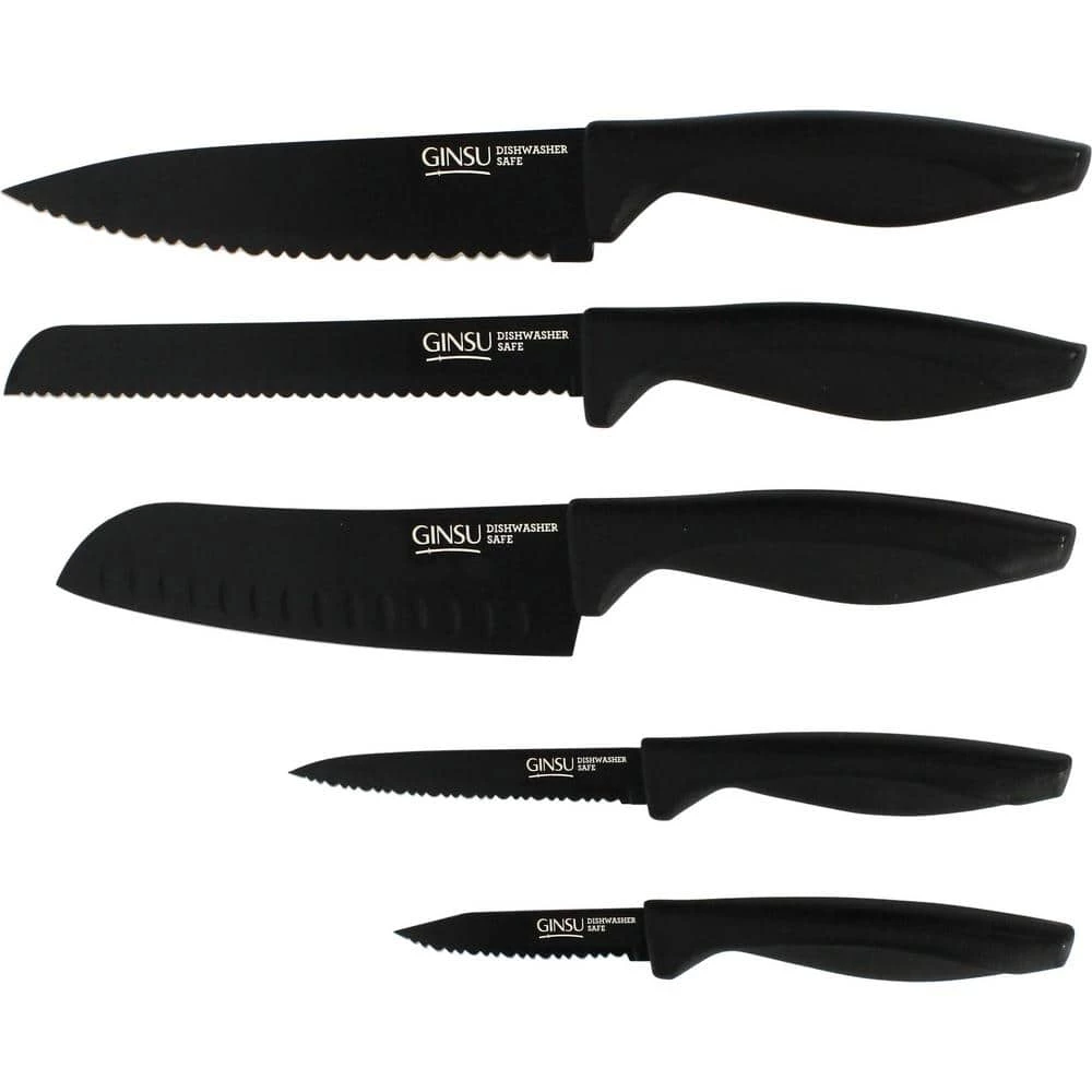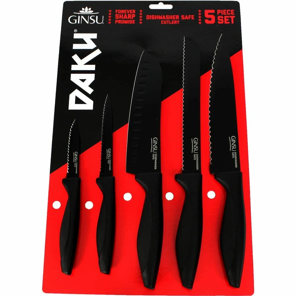 - Includes an 8 in. chef knife, 7 in. santoku knife, bread knife, utility knife, and paring knife