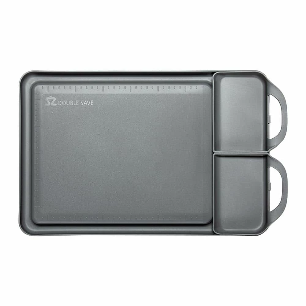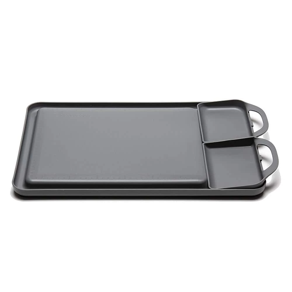 The dishwasher-safe chopping board is designed to separate, organize, and drain juices from foods. It contains two removable small compartments on the side. Place them on the counter to also use the space beneath for more surface area and to rest your knife. The grooves run around the board to easily drain, collect and neatly remove the juices without making a mess. Cut and arrange various foods neatly by using the embossed ruler on three sides of the board. Rinse the board, allow it to dry then flip it around to use it as a serving tray. The heat resistance range is -20 F to 248F. Materials are PP and PE. Color is Gray. Made in Korea
