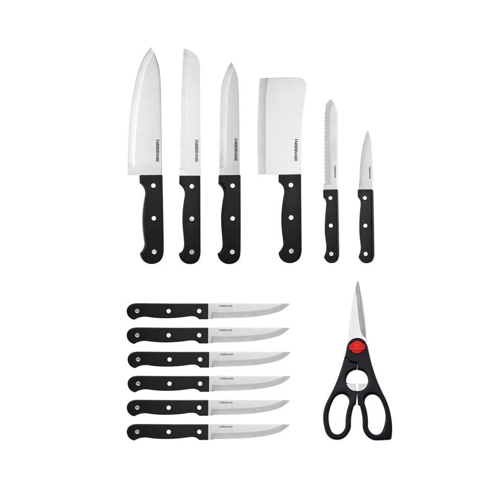 This Farberware 14-Piece Triple-Rivet Knife Block Set with Built-In Knife Sharpener includes 8 in. chef, 8 in. slicer, 6 in. cleaver, 5.5 in. serrated utility, 3.5 in. parer, 6 steak knives, shear, natural finish block with built in sharpener. This innovative Edge keeper technology block has a built-in sharpener to easily sharpen knives. Triple riveted style handles secure the full tang blade to the handle for safety and security. All knives feature high-carbon stainless steel blades which ensure the blades retain their ultra-sharp edge longer than conventional stainless steel. Not dishwasher safe. To clean, Hand wash with warm water and a mild detergent; rinse and dry immediately.