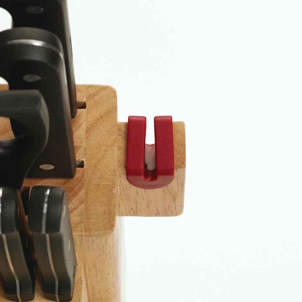 - Set includes an 8 in. chef, 8 in. slicer, 6 in. cleaver, 5.5 in. serrated utility, 3.5 in. parer, 6 steak knives, shear, natural finish block with built in sharpener