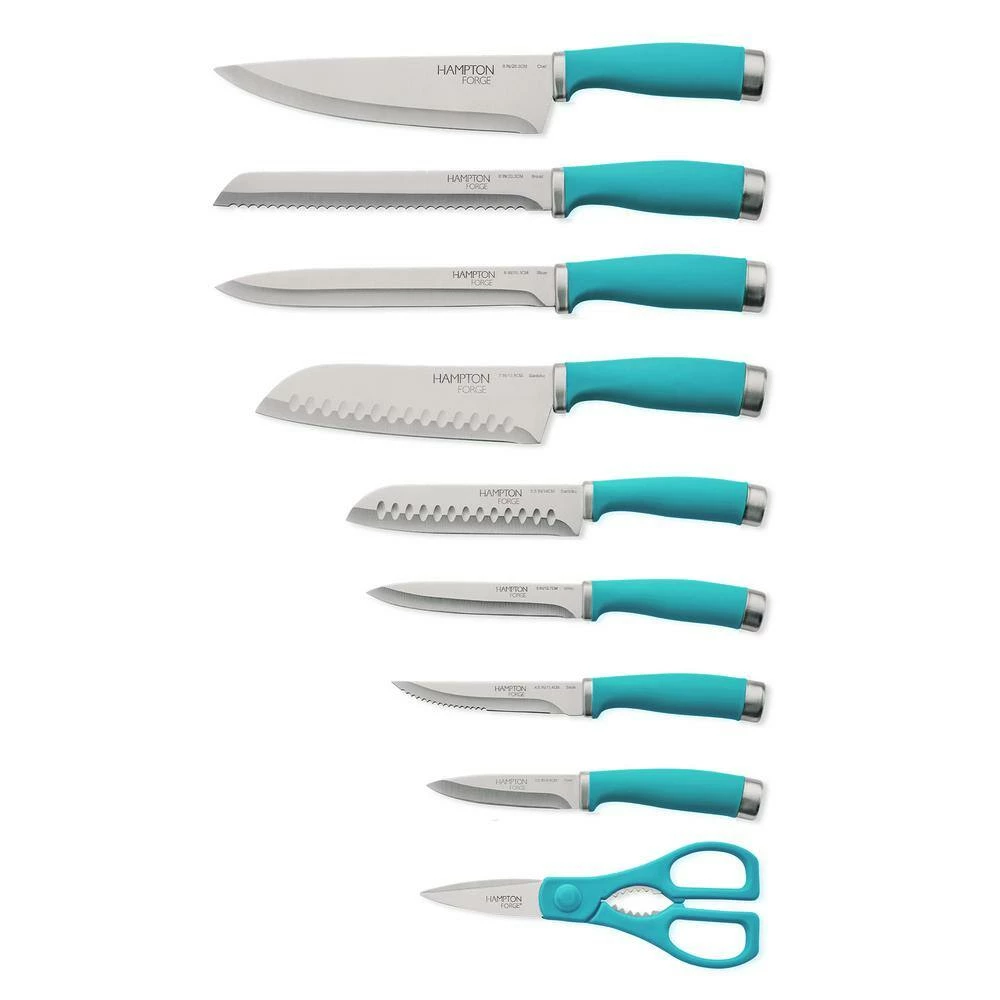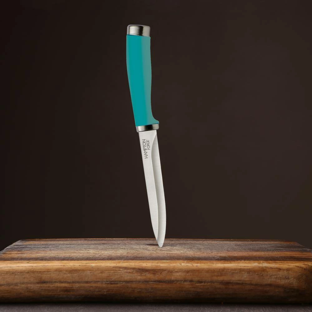 Cutlery is a great way to add a little character to your kitchen and to meal preparation. The Epicure Aqua 15 Piece Cutlery Block Set by Hampton Forge will quickly become one of your most essential kitchen tools. Whether you’re chopping, cutting, peeling or slicing, you’ll find these knives indispensable, featuring superior sharp, fine-edge blades and soft grip handles. With an airy sensibility and a pop of color, Epicure Aqua provides any kitchen connoisseur with every knife they need to cook and prepare a feast – in style. The set comes with a beautiful woodblock for easy storage.