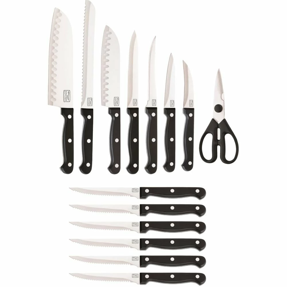 This 15-Piece Chicago Cutlery Essentials Knife Set has all the essential cutting instruments you need. Knives for peeling and paring, serrated knives, bread and steak knives, even kitchen shears. And they all have triple-compression stainless steel rivets for increased safety and stability. This knife block set makes a gift that will be appreciated for its precision – and its presentation, too.
