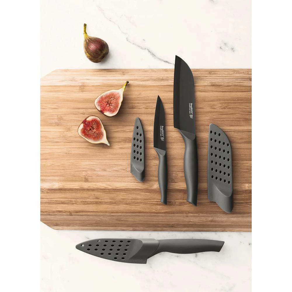 If you want one tool that will help you with a multitude of dicing, slicing and chopping jobs, the chefs knife is your go-to. This multitasker ensures clean cuts every time thanks to its sharp blade with non-stick coating, making your everyday cutting tasks smoother and quicker, and is comfortable to hold due to the ergonomic soft-grip handle. When youre done, just store it in the protective sleeve to make sure both your hand and the blade are perfectly protected.