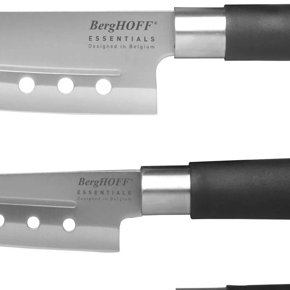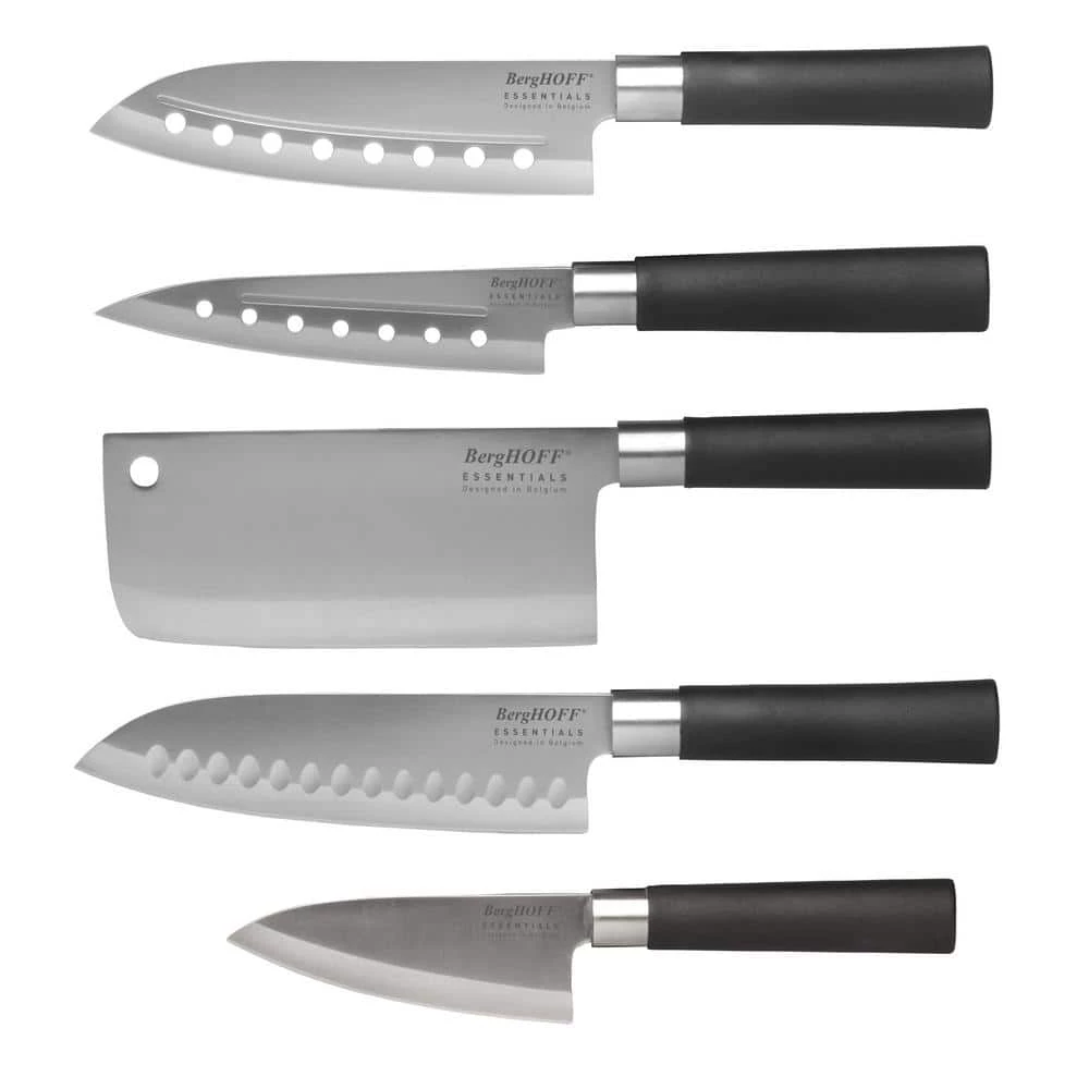 This set includes 5 in. santoku knife, 7 in. santoku knife with holes, 7 in. santoku knife, 4.5 in. santoku knife and 6.75 in. cleaver – A santoku knife is an Asian style knife with a straight edge. It’s an all-round knife for a variety of tasks. The wide blade allows for some typical activities like crushing garlic and scooping up the chopped ingredients on the blade. The holes in the blade reduce sticking of the cut items to the blade. The cleaver is designed to cut through meats and bones with the convenient hanging loop on the top of the blade. Be assured, this knife set is made of durable stainless steel and with proper care, will stand the test of time.