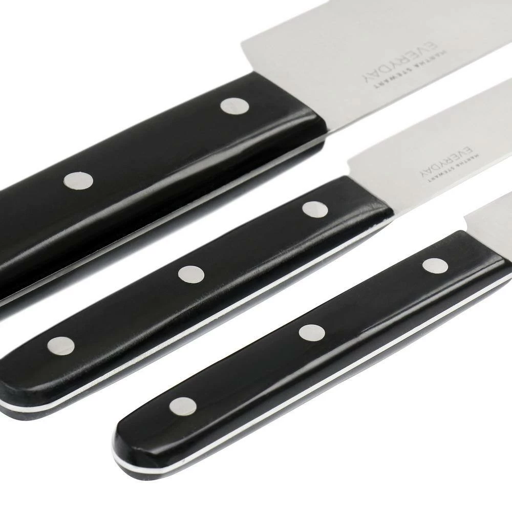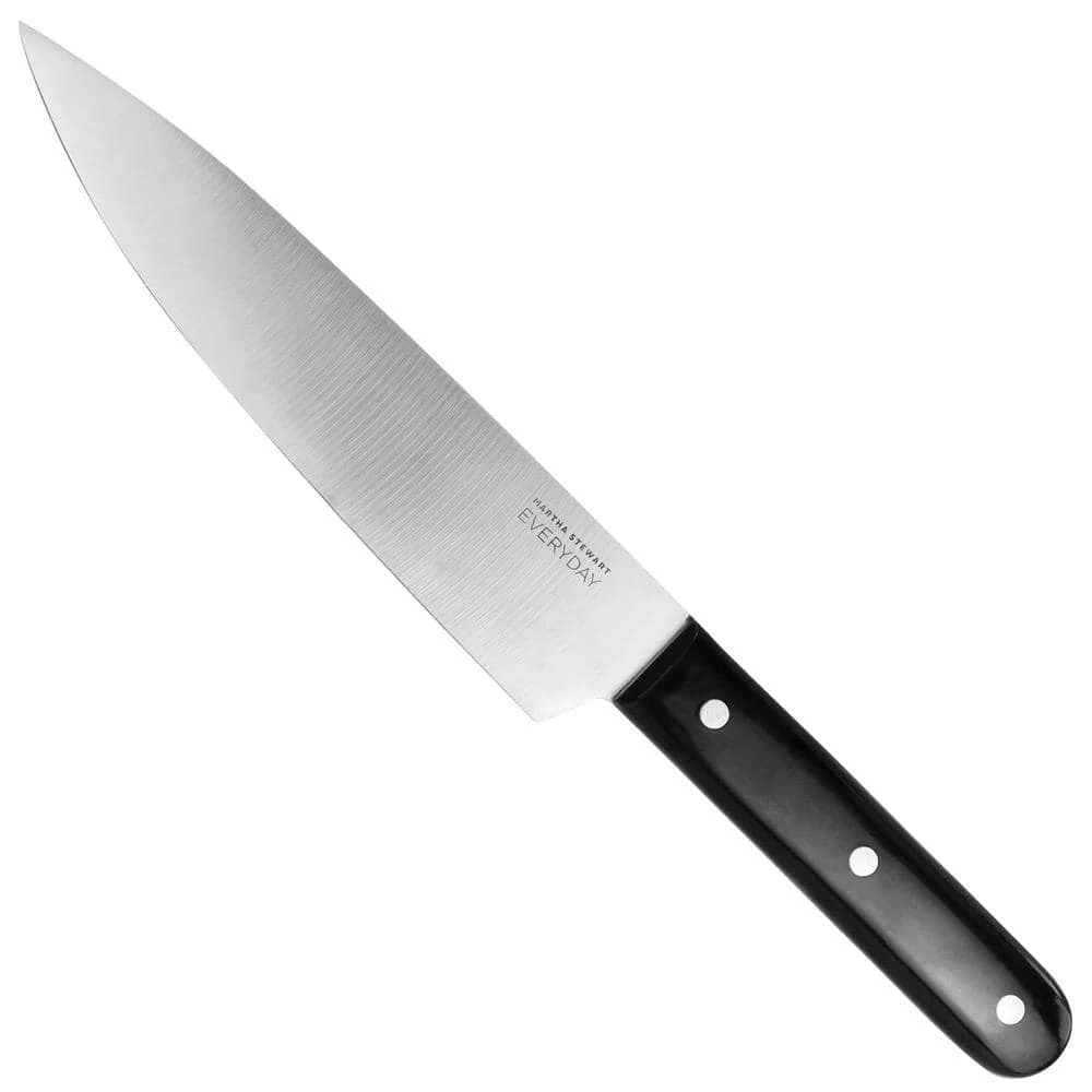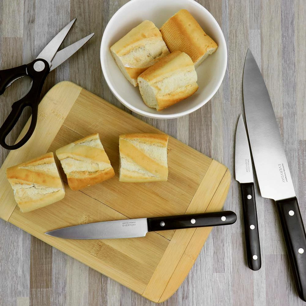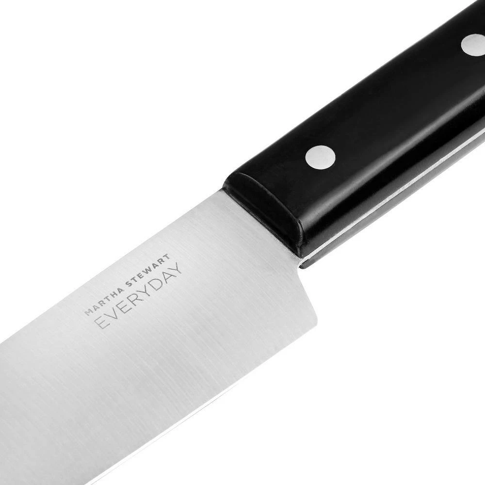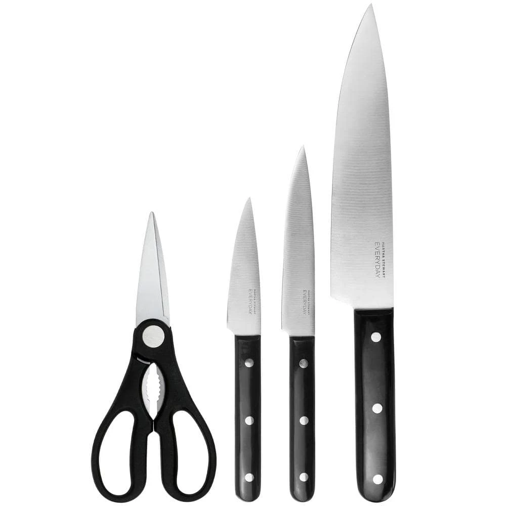 This 4-piece stainless steel cutlery set by Martha Stewart comes with your every day cutlery necessities. Set includes one 8 in. Chefs knife, one 5in utility knife, one 3.5in paring knife, and one set of kitchen shears. This cutlery set is the perfect go to for when you need to add on to your cutlery collection or for when you simply need the basics to complete your every day cooking prep. Constructed with high-carbon stainless steel blades that stay sharp longer for easy cutting of all food types. Ergonomic triple riveted full tang handles provide balance, comfort, and durability.