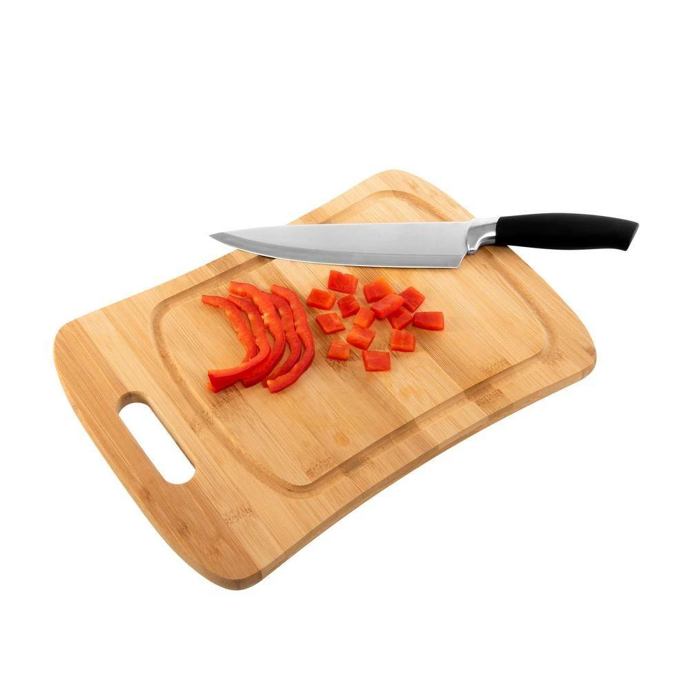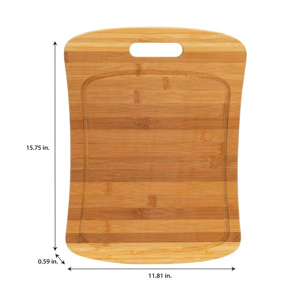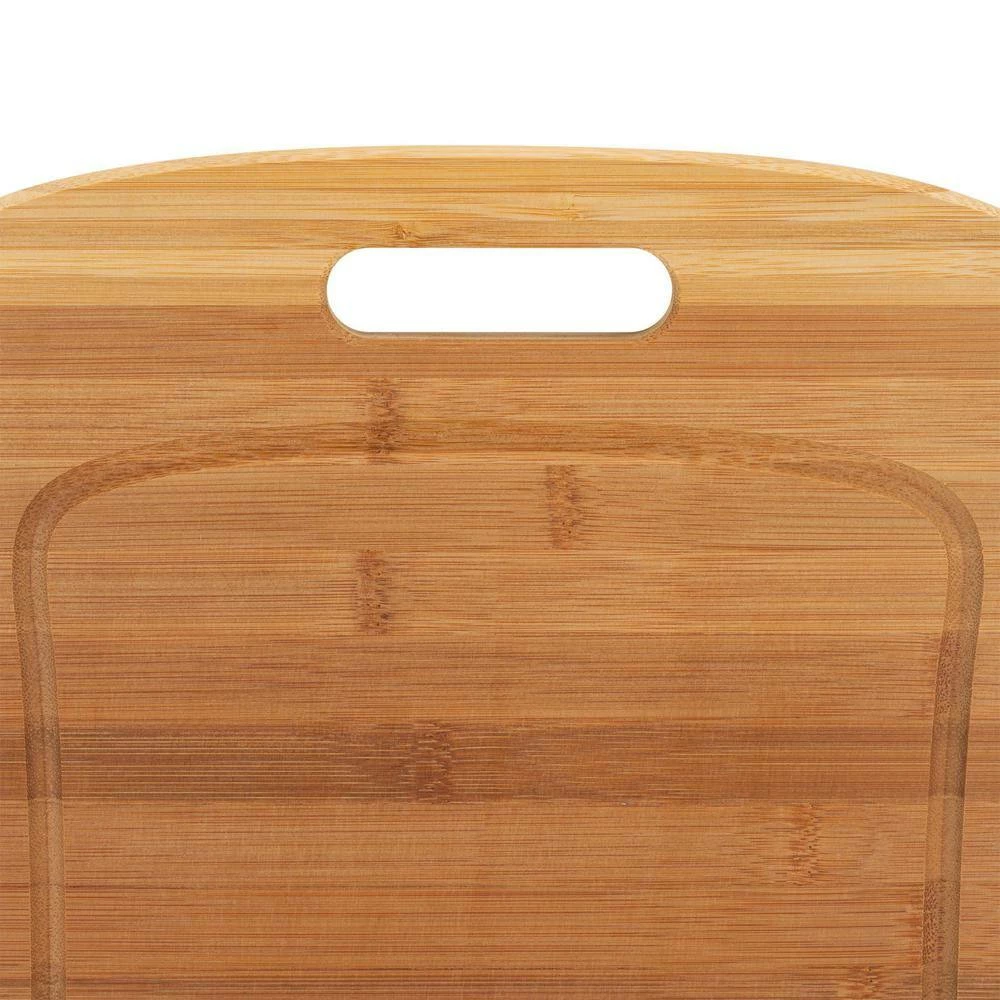 Prep your meals with the Kitchen Details Extra Large Curved Bamboo Cutting Board. The ultra-thick and durable bamboo board prevents warping over time. The natural bamboo finish is also cut resistant, so the board lasts longer and food particles won’t get trapped in the cut marks. With its dual cutting surface, you can prepare two types of food before you have to wash it. The outside drip edge collects excess runoff so that what you are cutting stays on the cutting board and does not dirty the countertop. The cutting board has a handle for carrying and for easy transportation of ingredients around the kitchen. This cutting board is SGS Certified and safe for all types of foods.