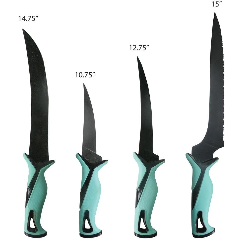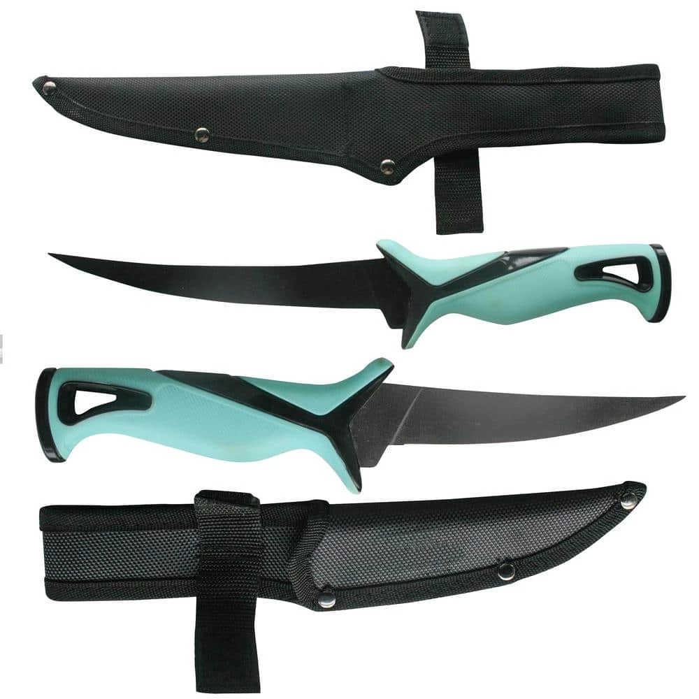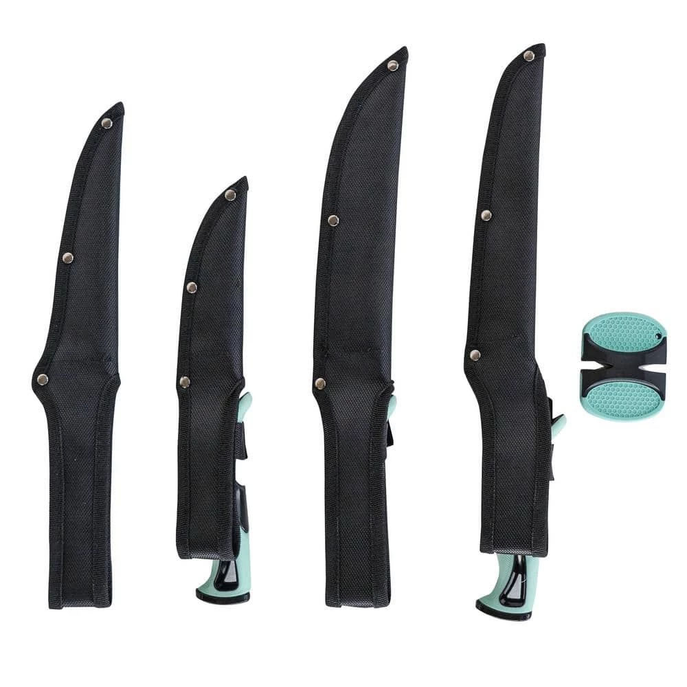 The KUDA Fishing Fillet 5-Piece Knife Set has everything you need to clean and process the day’s catch. The Fishing Knife Set is made with durable and easy to clean stainless steel blades and features a molded plastic slip-resistant grip making the knives easy to hold when things get messy. Each knife comes with its own nylon sheath with attached belt loop. The included knife sharper ensures you always have the fresh edge you need to expertly clean your catch. Anglers and hunters alike will want this Knife Set to clean and butcher fish and wild birds. Set includes: 5 in. and 7 in. traditional flexible fillet knives, each with nylon sheath, 9 in. stout boning steaking knife with nylon sheath, 9 in. serrated blade with nylon sheath, Knife sharpener.