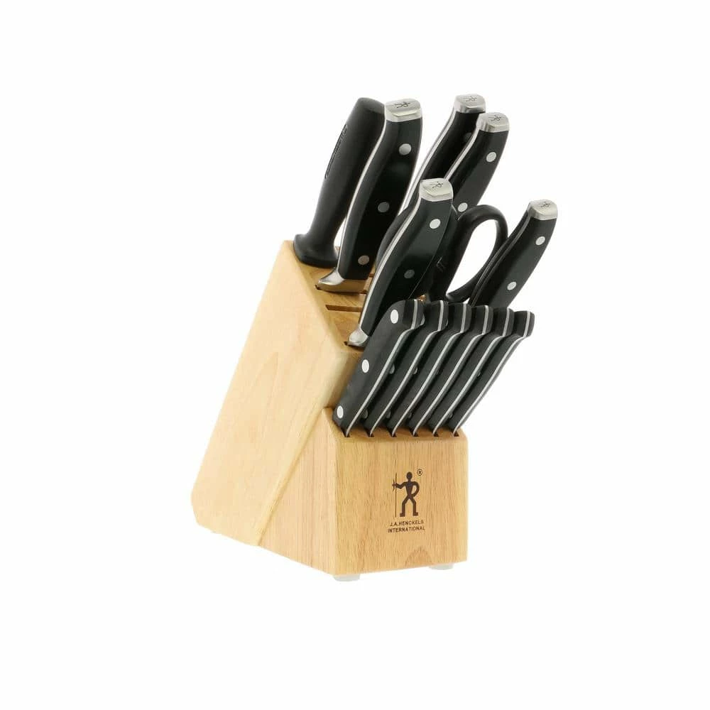 The Henckels Forged Premio 14-Piece Knife Block Set has a knife to handle every kitchen task. Fabricated from high-quality German stainless steel, the fine-edge blades are perfect for precision cuts. The all-rounder 8 in. Chef’s Knife is ideal for chopping herbs and dicing onions while the 5 in. Serrated Utility Knife cleanly slices through tomatoes. Perfectly peel apples with the small 3 in. Paring Knife. The forged bolster construction seamlessly transitions from blade to handle for durability and balance. Curved for comfort, the triple-rivet handle features a stylish, stainless steel endcap that adds aesthetic appeal to your knife block. Stamped with the single man Henckels’ logo, this Halberdier symbolizes Forged Premio’s superb quality at a remarkable value. Henckels makes essential kitchen tools every home chef needs. From steak knives to spatulas, every product boasts high quality at an exceptional value. Created in 1895 by Zwilling J.A. Henckels, this value-driven brand guarantees the same durability, design and ease of use for which the global company is known. Equip your kitchen with expertise with Henckels.