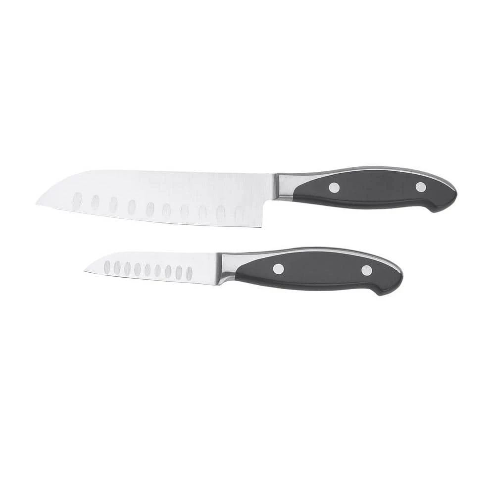 The Henckels International Forged Synergy 2-piece Asian Knife Set is perfect for performing detailed kitchen tasks with ease. Fabricated from high-quality German stainless steel, the fine-edge blades produces precision cuts. This set features a 3 in. Hollow Edge Kudamono Paring Knife and a 5 in. Hollow Edge Santoku Knife. Both blades have small indentations, aka grantons, which prevent food from sticking while cutting.