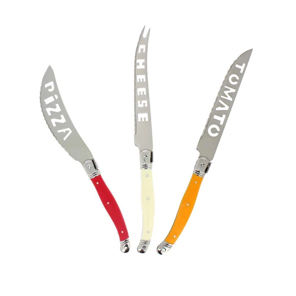- Set includes 10 in. tomato knife, 10 in. cheese knife, and 9 in. pizza slicing knife, each knife says what it should be used for on the blade