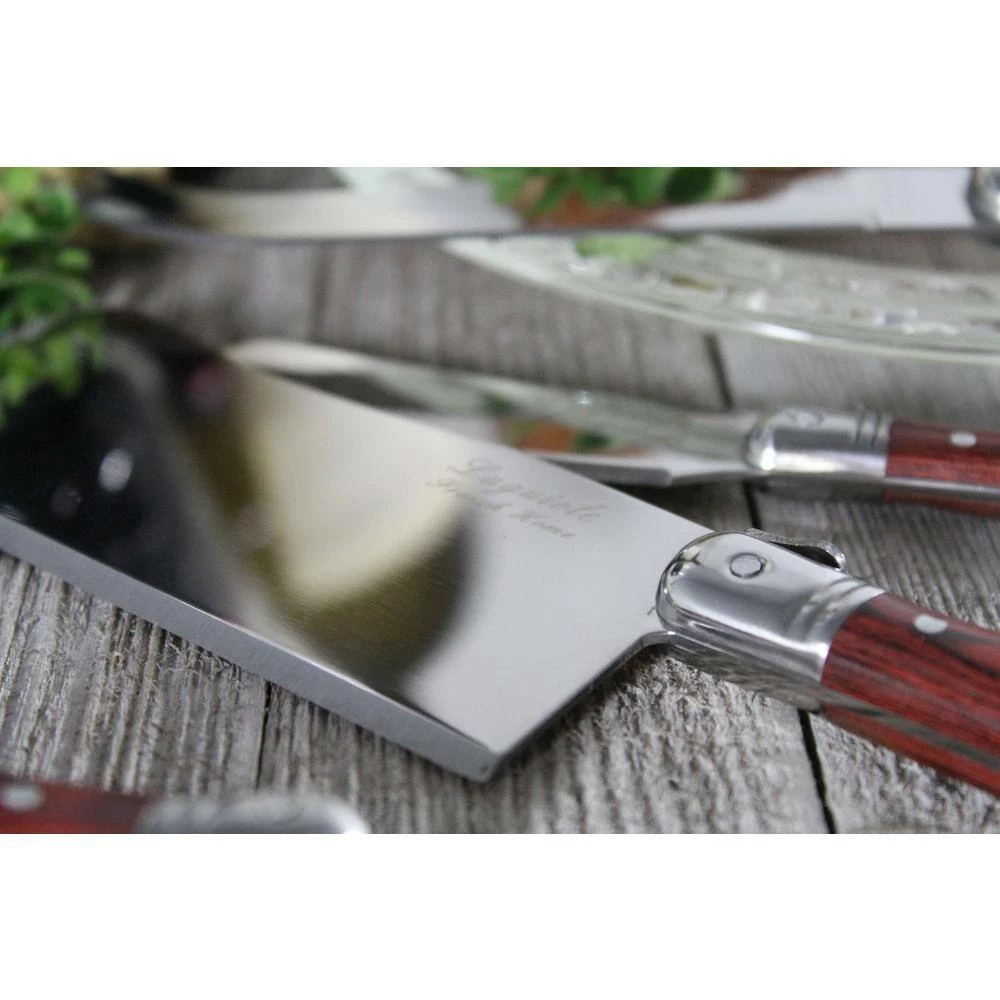 The ultimate 5 piece Laguiole cheese and wine set! French Home’s three stainless steel cheese knives combined with a matching bottle opener and cork screw are essential to any bar, cocktail or dinner party. The traditional and elegant Laguiole design with the iconic three rivet curved handle and bee emblem is comfortable to hold and perfectly balanced. The Pakkawood handles add warmth and refinement to your casual or formal get together. The set includes an 8.5″ Cleaver, 9.25″ Spear and 6.25″ Spreader, perfect for serving a variety of cheeses. Laguiole is a town in France where this style of cutlery originated.