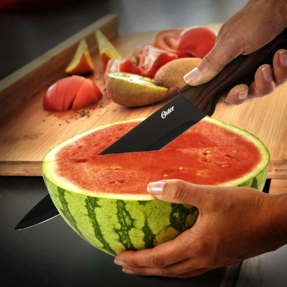 Update your kitchen cutlery collection with the Oster Godfrey 5-Piece Stainless Steel Black Cutlery Set with Wood Print Handles. This 5-piece cutlery set comes complete with a wide assortment of different knives including a pairing knife, utility knife, bread knife, slicer knife, and a chef knife. Each blade is crafted from quality nonstick stainless steel for a clean and sharp cut. Each knife also comes equipped with a soft touch handle to ensure a comfortable grip.