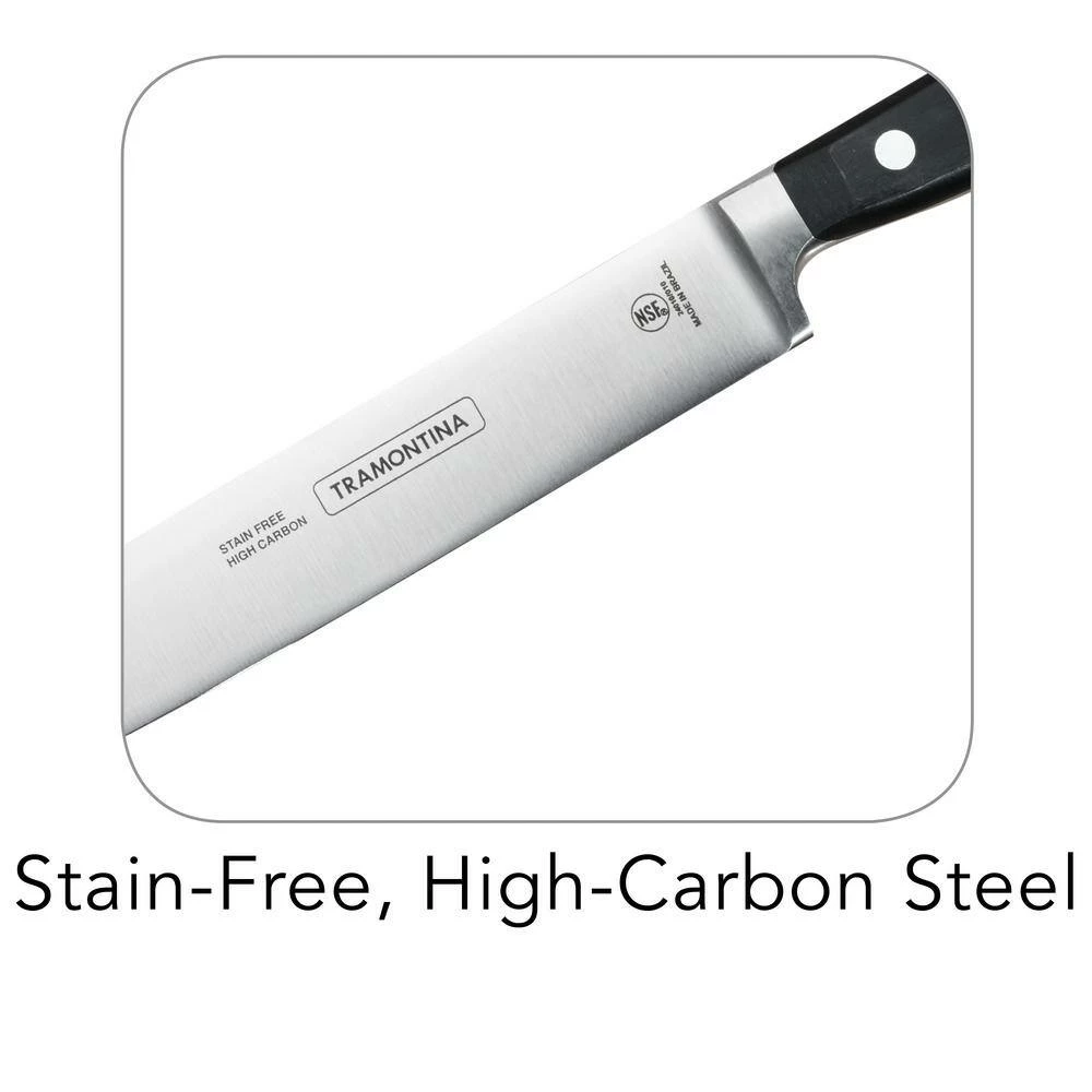 Tramontina’s Professional Series 10 in. Slicer is forged from a single solid piece of premium high-carbon stainless steel for unrivaled strength and durability. Blade is taper ground and precision-honed to a fine edge, while the heft of the full tang, combined with the bolster provide weight and rigidity for safety and superb balance. The design of the handle maintains the traditional style preferred by executive chefs with an ergonomic emphasis on perfect balance and a firm, comfortable grip. The Slicer is part of Tramontina GOURMET, a collection of premium products engineered and manufactured with the finest design, materials and workmanship, outperforming similar products within the market and delivering the best quality and value to the cooking professional and enthusiast alike.