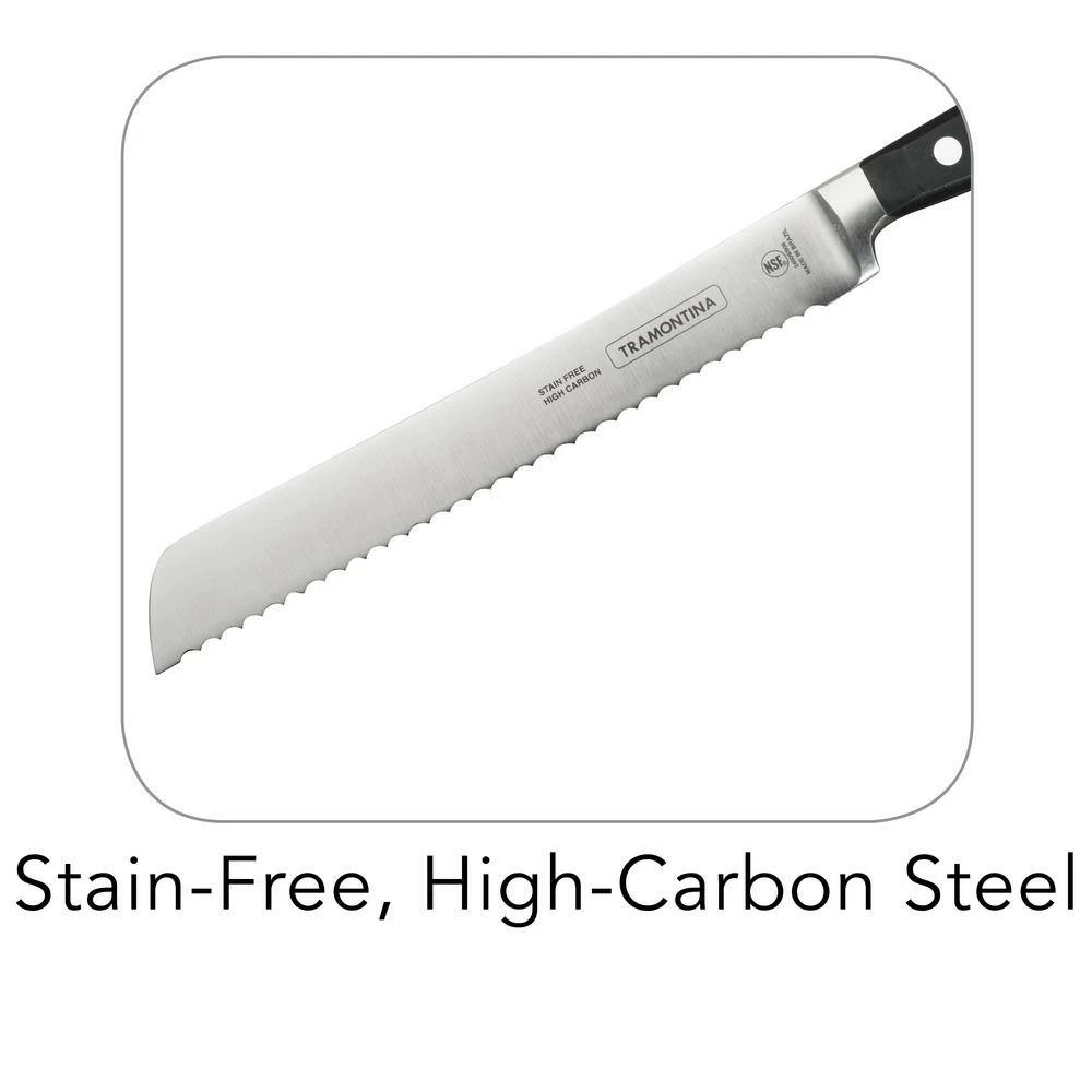 Tramontina’s Professional Series 8 in. Bread Knife is forged from a single solid piece of premium high-carbon stainless steel for unrivaled strength and durability. Blade is taper ground and precision-honed to a fine edge, while the heft of the full tang, combined with the bolster provide weight and rigidity for safety and superb balance. The design of the handle maintains the traditional style preferred by executive chefs with an ergonomic emphasis on perfect balance and a firm, comfortable grip. The Bread Knife is part of Tramontina GOURMET, a collection of premium products engineered and manufactured with the finest design, materials and workmanship, outperforming similar products within the market and delivering the best quality and value to the cooking professional and enthusiast alike.