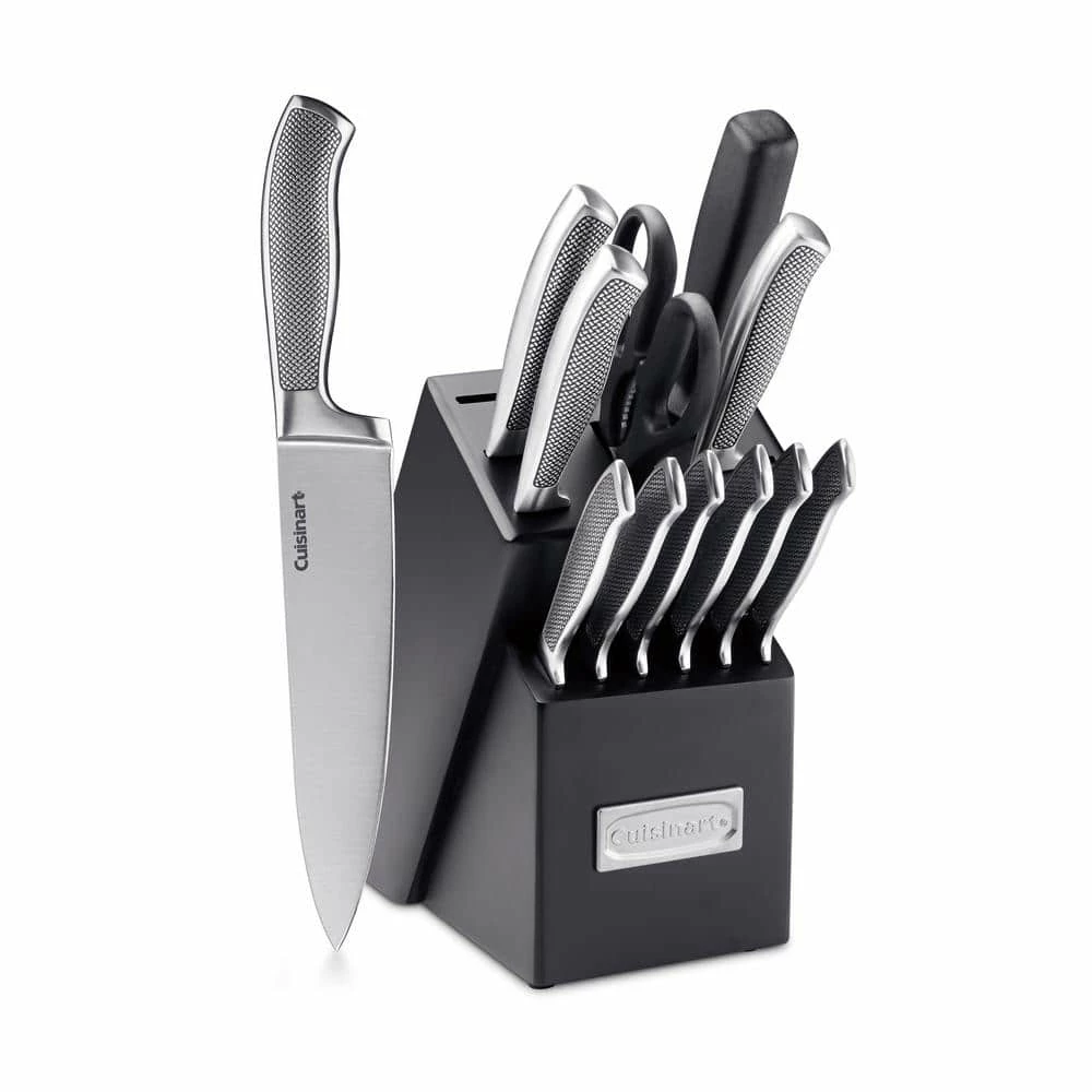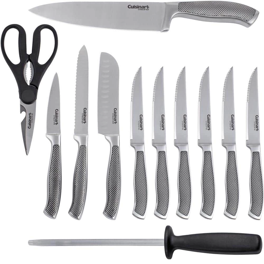 The Cuisinart C77SS-13P Graphix Collection 13-Piece Stainless Steel Cutlery Block Set features superior stainless steel blades for precision cutting. Ergonomically designed handles are textured for comfortable control. The textured handles add an innovative look so these superior knives fit in with your kitchen decor.