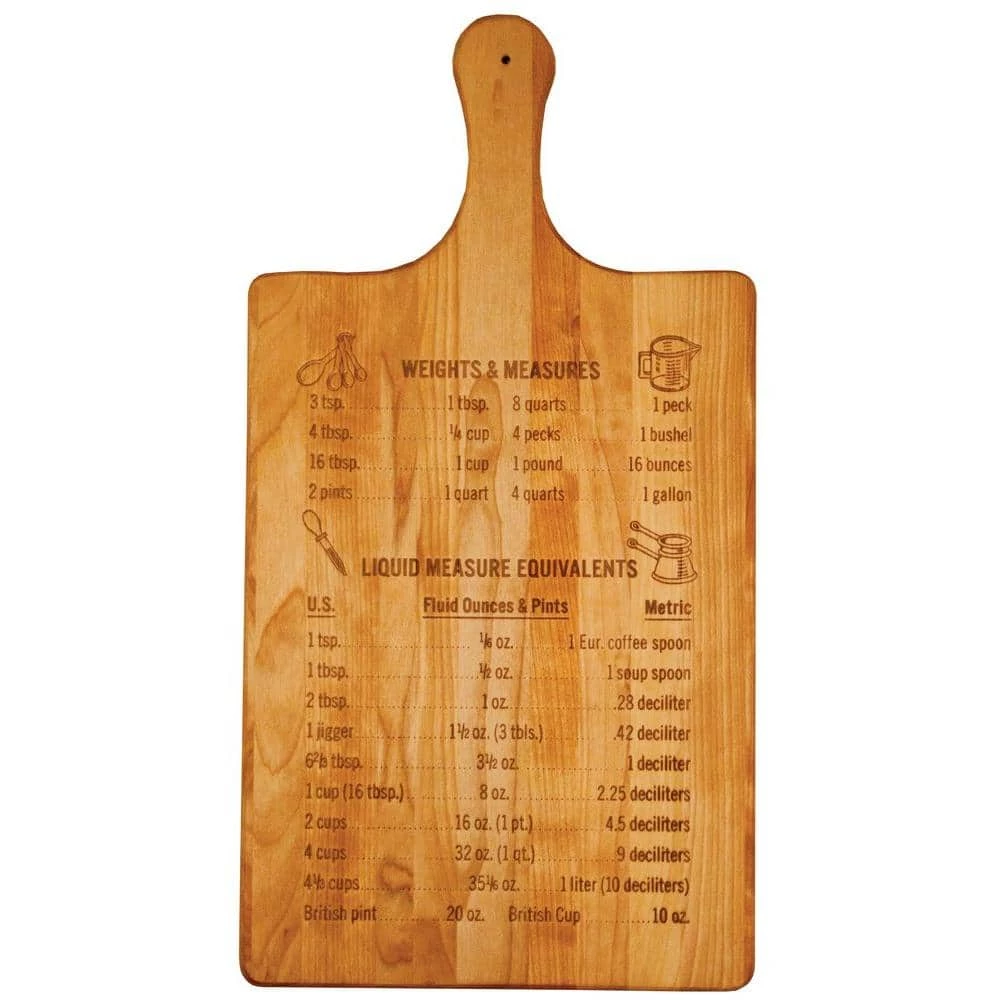 Proudly display this paddle board featuring all of the measurements and conversions and baker needs readily available. This board is a must-have for any serious baker or home cook. The large size makes is a fully functional cutting board, the branding makes is a beautiful display piece. Created from sustainably harvested domestic hardwood and finished in mineral oil to bring out the natural beauty of the wood.