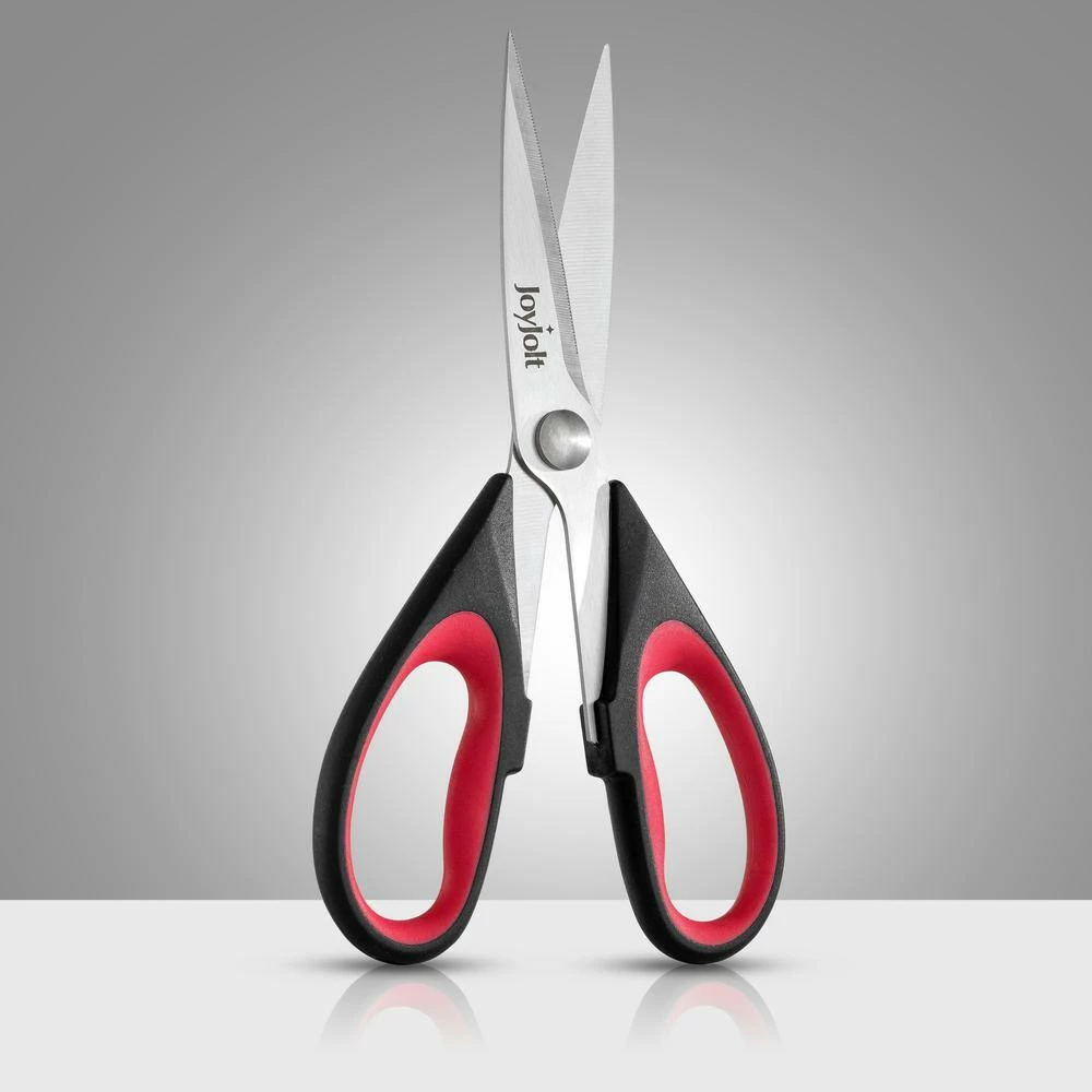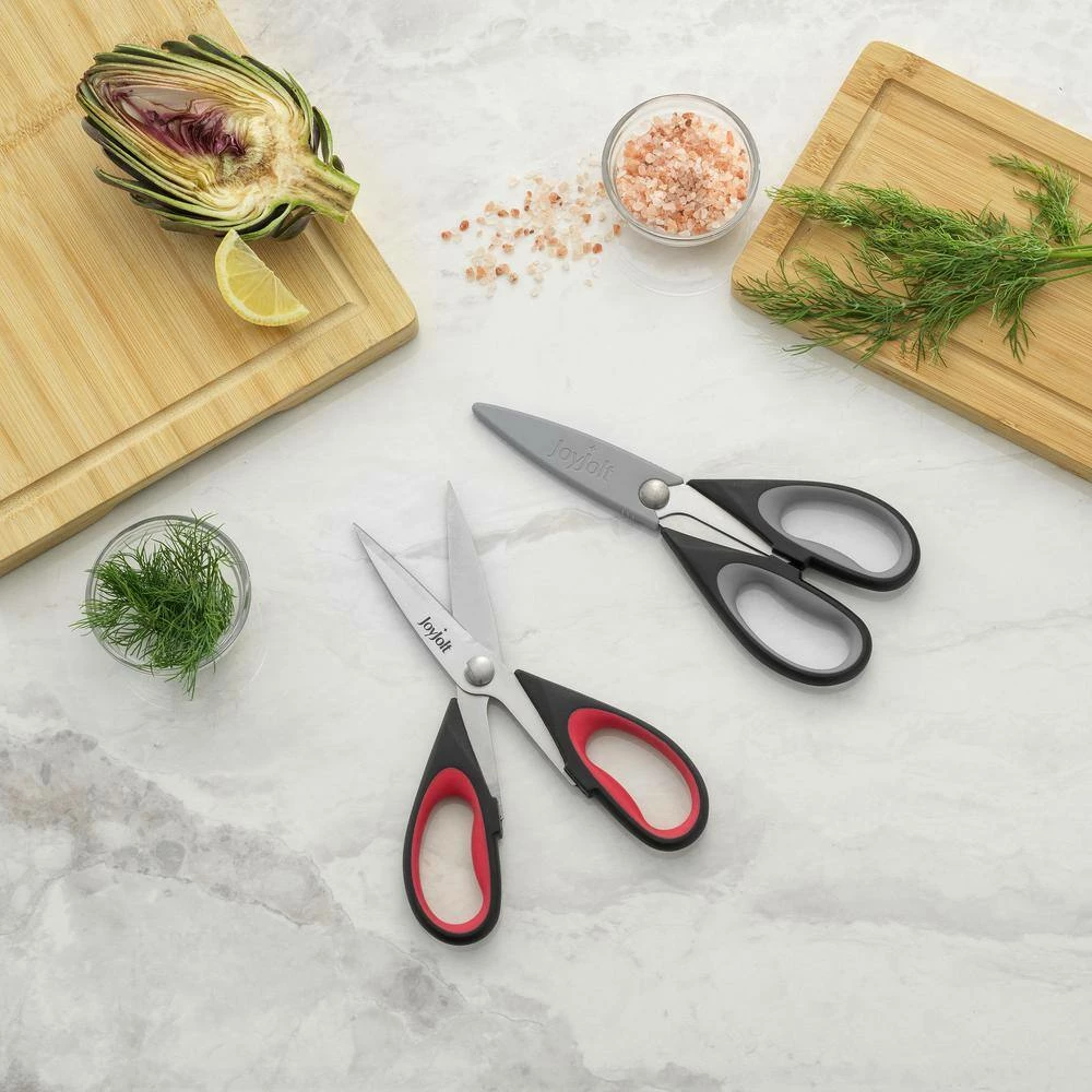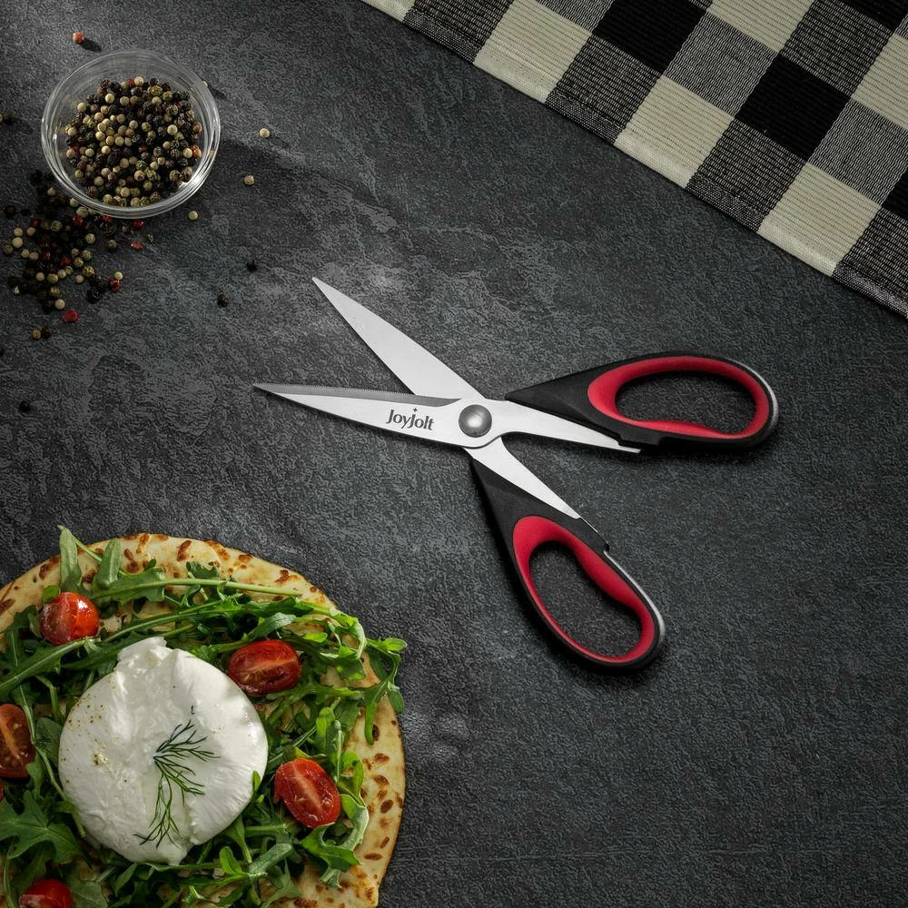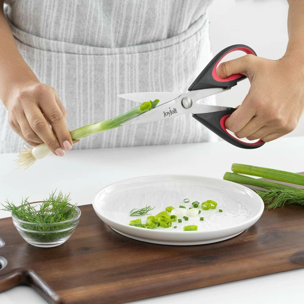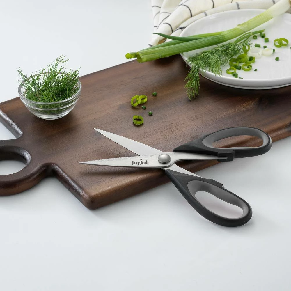 JoyJolt Kitchen Scissors. The Heavy-Duty Kitchen Scissor for Straight Clean Cuts. Put the paring knife down, because JoyJolt Heavy-Duty Shears are ready to make light work of cutting. Slices bacon into neat clean strips, chops leafy greens without bruising and cuts toddler food with ease. But they’re super strong too. these heavy blade kitchen scissors cuts a chicken in half through the breastbone and slices through strong bones, skin and meat with ease. They make great turkey shears. And while you shouldn’t cut carpet with these Heavy-Duty kitchen scissors, it’s encouraging to know they’re strong enough for the tough jobs, yet sharp enough for cutting the crusts off bread or delicate snipping. They’re also more hygienic cooking shears. Free from ridges on the handles and other nooks and crannies that harbor old decaying food. And that’s exactly the hygiene you need if dealing with poultry or bacony bits.
