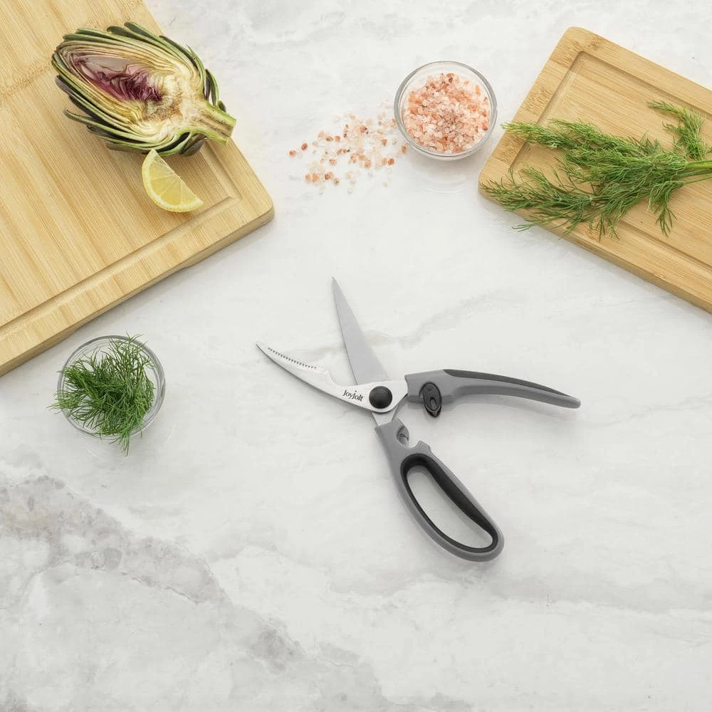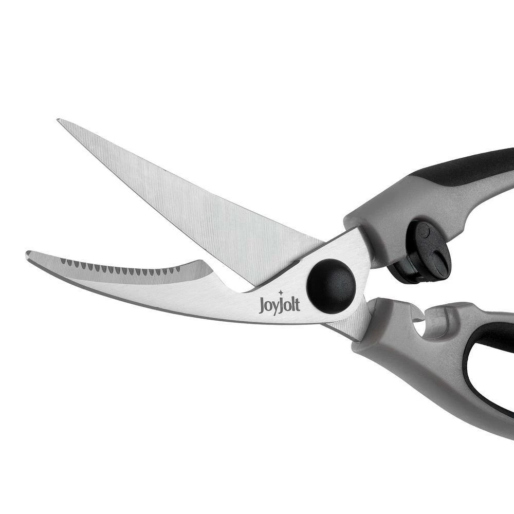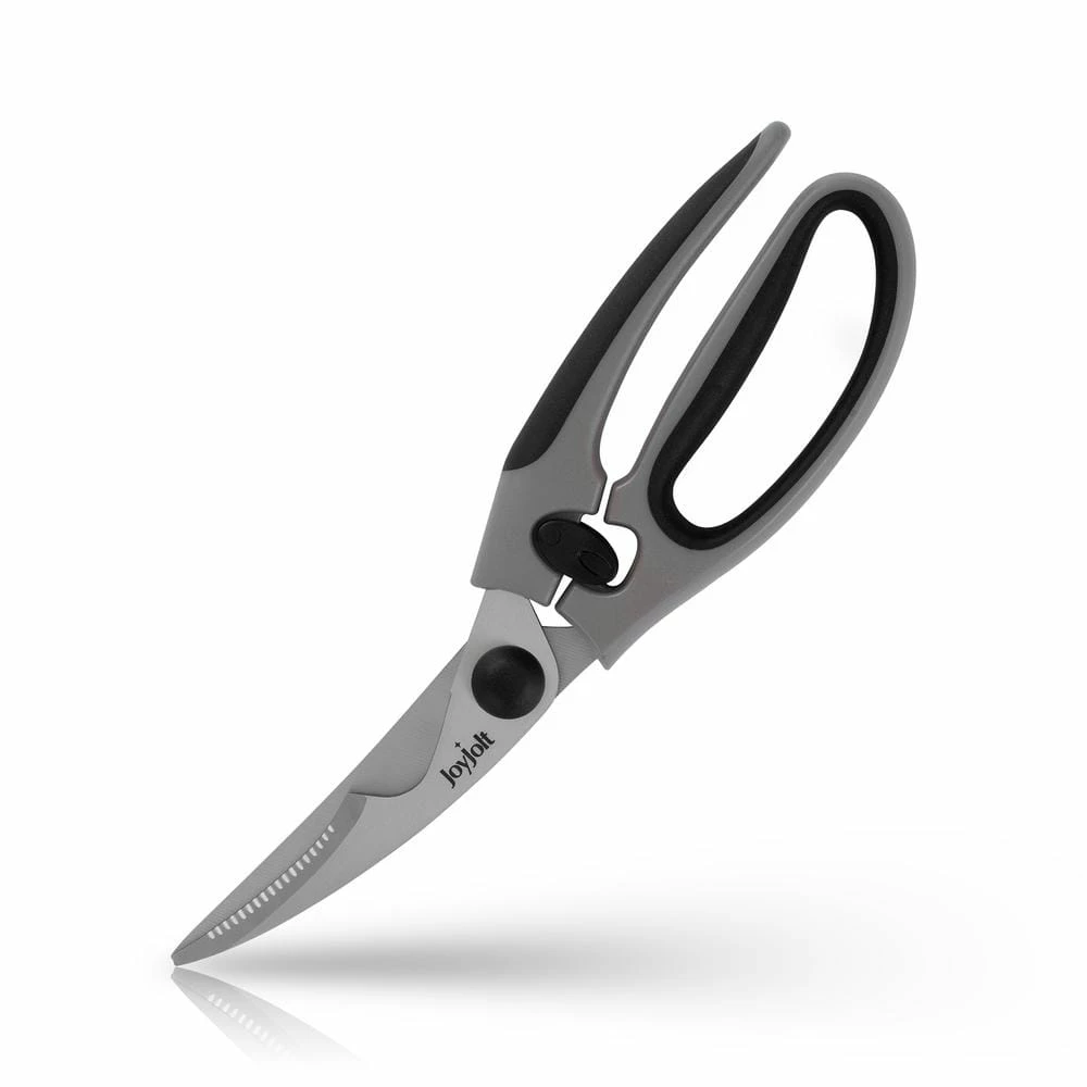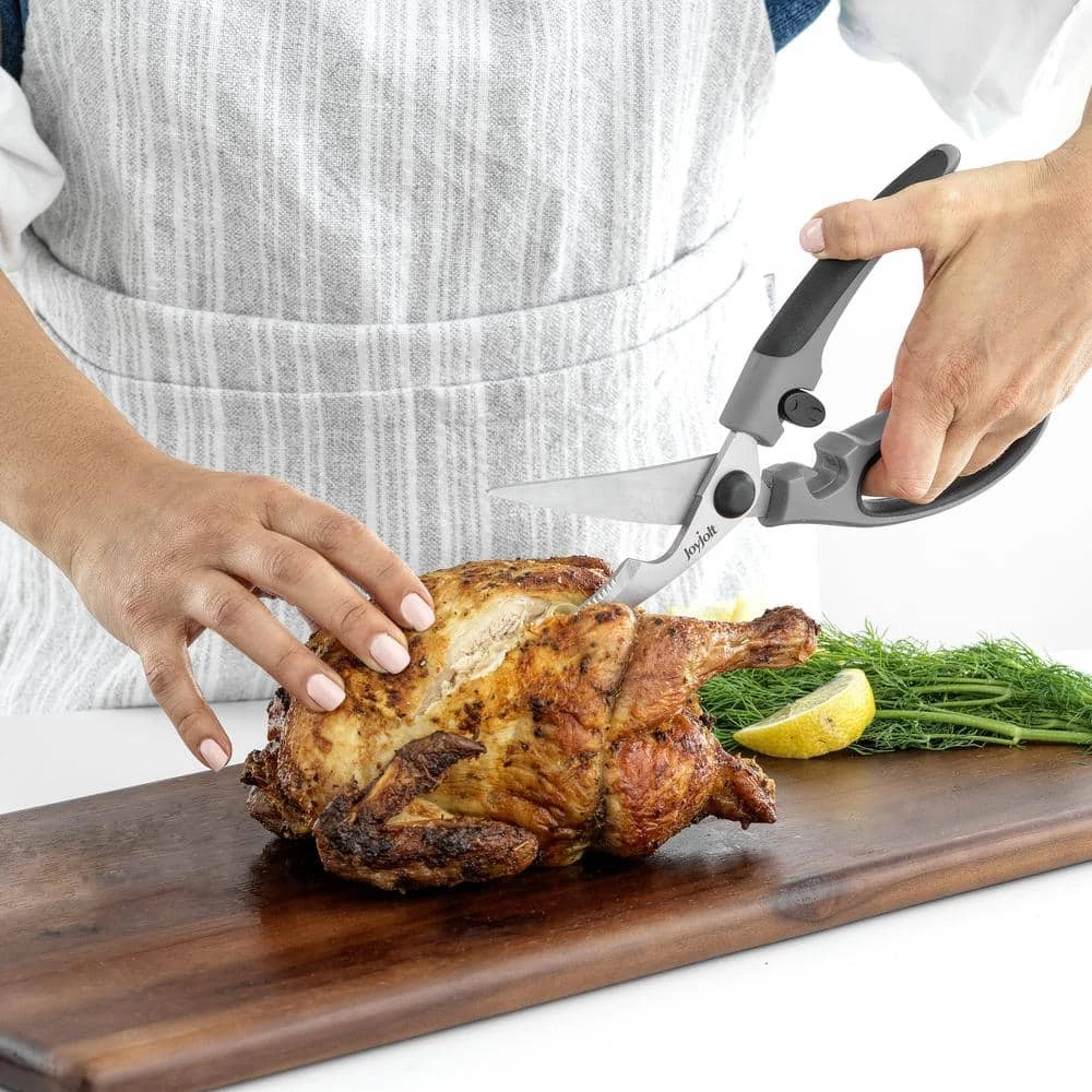 JoyJolt Kitchen Scissors Heavy-Duty Poultry Shears, Cuts Like a Knife Through Butter. Put the cleaver down, because JoyJolt Poultry Heavy-Duty Shears are ready to make light work of cutting. Cuts a chicken in half through the breastbone and slices through strong bones, skin and meat with ease. They make great spatchcock turkey shears. And while you shouldn’t cut carpet with these Heavy-Duty kitchen scissors, it’s encouraging to know they’re strong enough for that level of tough. So you can use these kitchen shears poultry butcher shears for red meat, seafood and fibrous vegetables. They’re also more hygienic cooking shears. Free from ridges on the handles and other nooks and crannies that harbor old decaying food. And that’s exactly the hygiene you need with dealing with all things poultry.