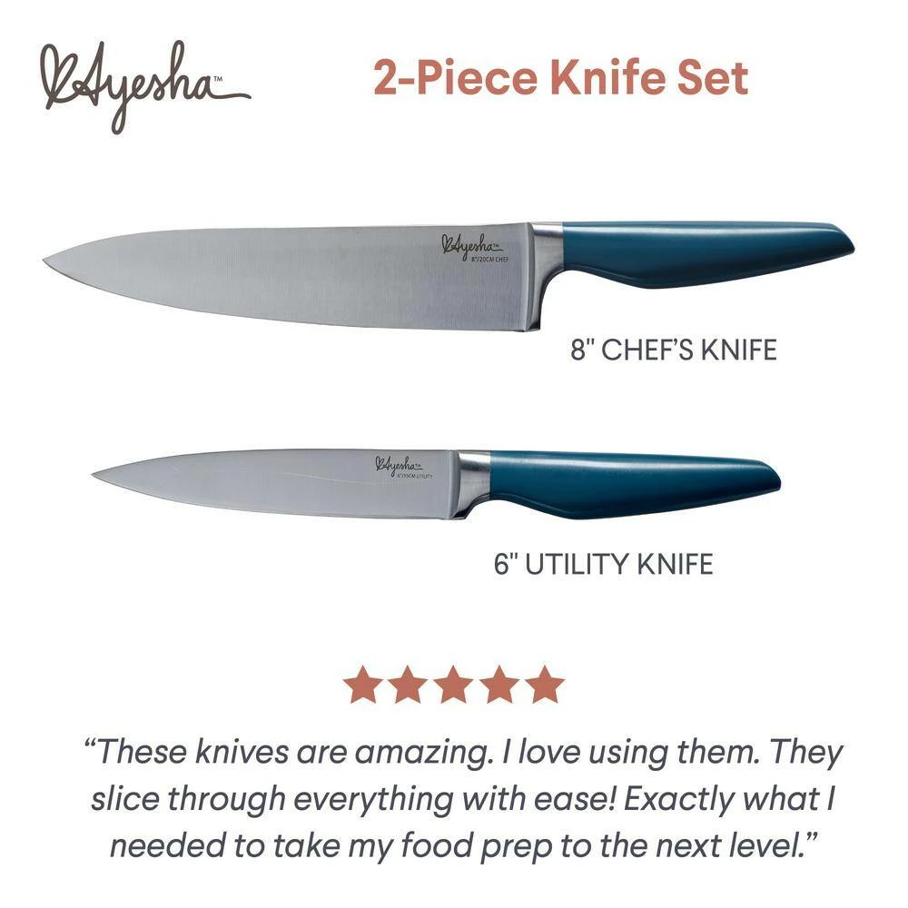 Equip your kitchen with the most essential cutlery and show off your mad slicing and dicing skills with the Ayesha Collection Japanese Steel Cooking Knife Set. Finely honed and razor sharp for long lasting performance, this Ayesha Curry knife set is sure to please. Crafted from high quality Japanese steel, the 8-inch utility knife and 3.5-inch paring knife are finished with a well balanced handle for a firm and comfortable grip when chopping, slicing or paring.