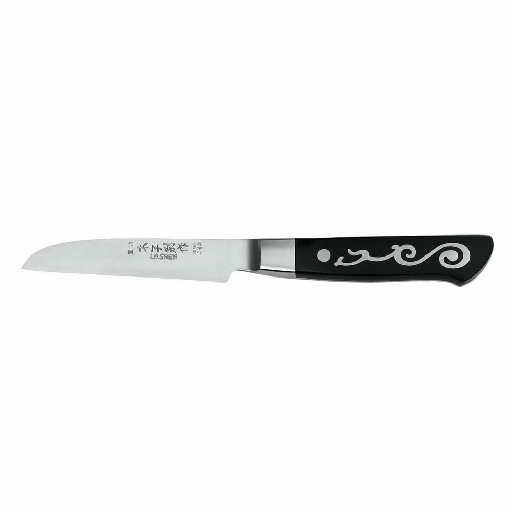 Common name: Sheeps hoof paringIt is small but very sharp designed for intricate peeling, trimming, carving and garnishingI.O. Shen has overcome the brittleness of hard steel, using a layer of super hard steel (Rockwell 62), sandwiched between two layers of softer stainless steel (Rockwell 10) to produce the ultimate cutting edge. We call this Triplex Steel Technology. I.O.Shen Mastergrade built all knives using the latest technology so that it is not only amazingly sharp but will retain the edge sharpness for a phenomenal amount of time. Handcrafted by our Master attained to 15 angle edge, slicing becomes easy and fun. Each I.O.Shen knife has carefully handcrafted and took in average 7 hours hand finished. Designing unique handle with Yin Yang philosophy distinguishes I.O.Shen from any other knife, improving balance and handle stability, and beautiful work of art handle.The Tai Tang handle is not just an embellishment but it is actually an integral part of the handle frame (the Tang).The handles made with ebonite which is durable and heat resistant. (no dishwasher cleaning please)