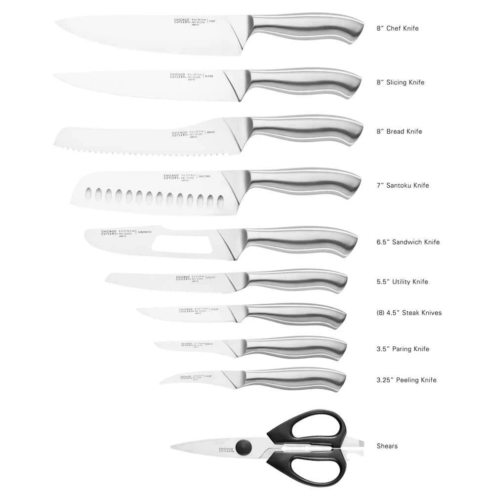 - (1) 8 in. chef knife, (1) 8 in. slicer, (1) 8 in. serrated bread knife, (1) 7 in. santoku, (1) 6.5 in. serrated sandwich knife, (1) 5.5 in. utility knife, (1) 3.5 in. paring knife, (1) 3.25 in. peeling knife, (8), 4.5 in. steak knives, (1) shears, (1) wood block