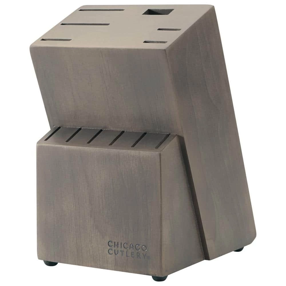 - Contemporary and stylish gray washed wood block keeps knives secure.