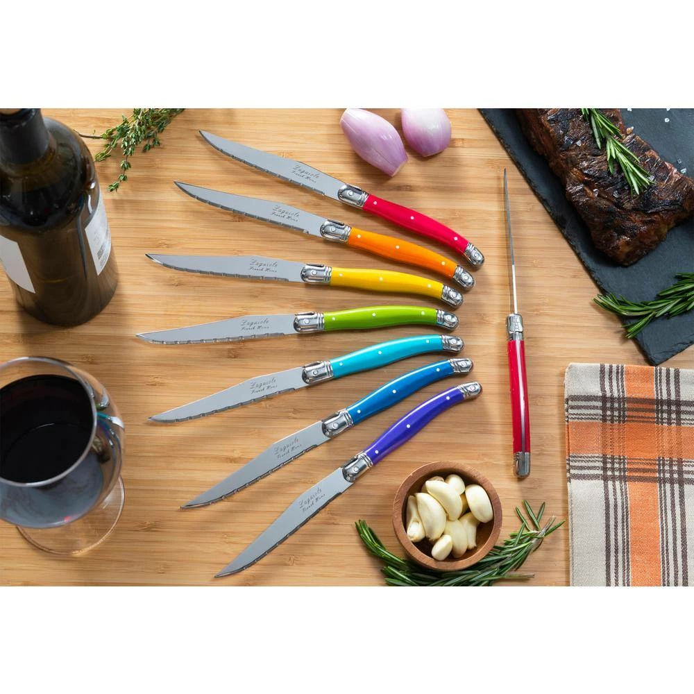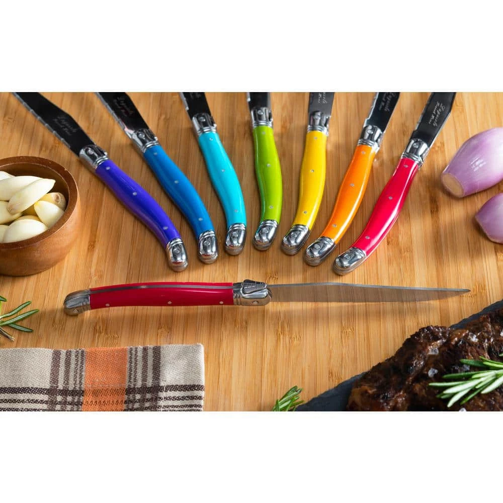Express your je ne sais quoi and celebrate all the colors of the rainbow with this fun 8-piece steak knife set. French Home’s traditional and elegant Laguiole design steak knives are comfortable to hold and perfectly balanced. Laguiole knives are a traditional style of knife that originated in France and is renowned for having a three rivet curved handle and a bee emblem on its bolster. The bee is a symbol of Napoleon and French monarchy. These steak knives feature handles in bright and bold rainbow colors celebrating individuality and inclusivity. The stainless-steel blades of this cutlery set are 1.8mm thick and slice effortlessly through steak. These steak knives are dishwasher safe and serrated, so they do not need sharpening. Laguiole is a town in France where this style of cutlery originated in the 1820’s.