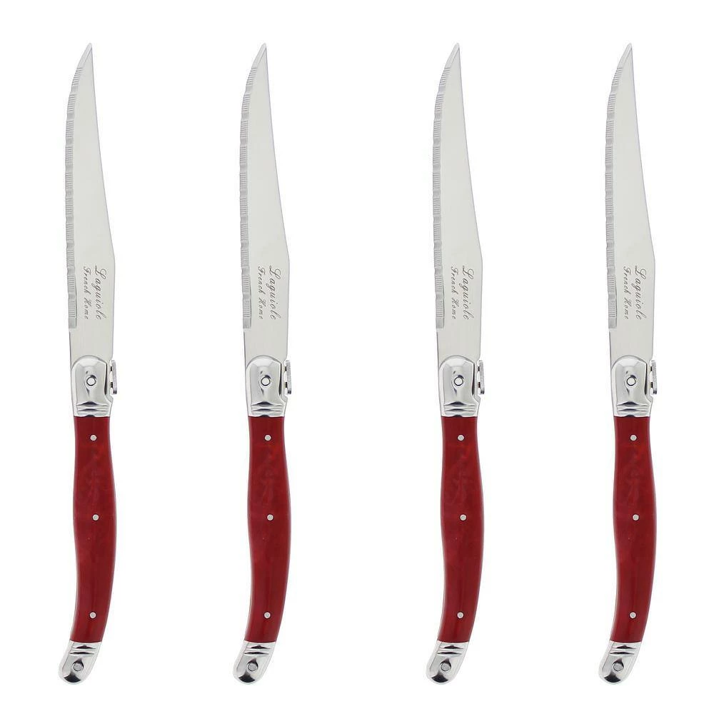 French Home’s traditional and elegant Laguiole design with the iconic three Rivet curved handle and Bee emblem is comfortable to hold and perfectly balanced. The knives have faux marble handles and blades that cut effortlessly. Laguiole is a town in France where this style of cutlery originated.