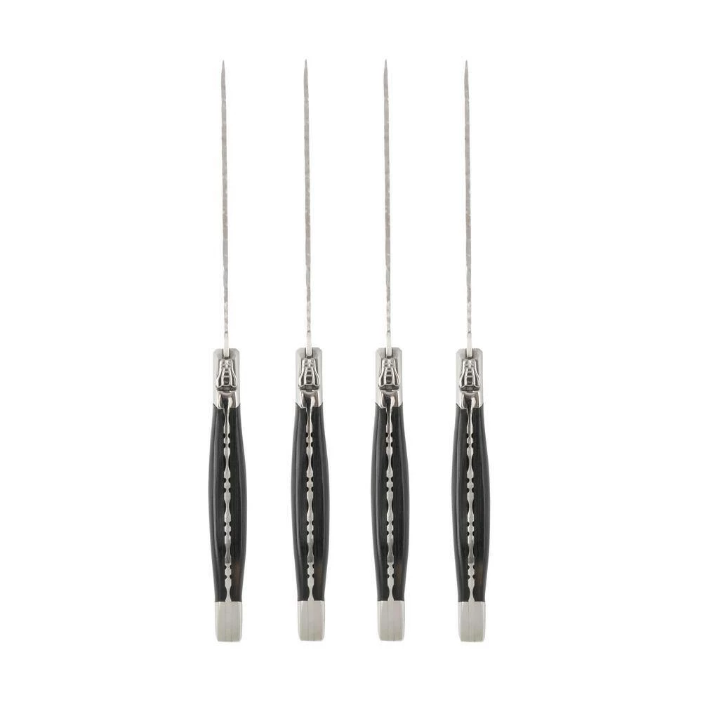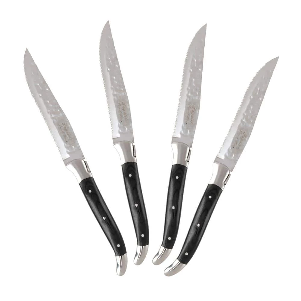 French Home’s traditional 10 in. grande connoisseur Laguiole steak knives have the iconic three rivet curved handle and artfully hammered stainless steel cutting blades. The knives are perfectly weighted with 2.5mm fully tanged blades, black wood handles that fit comfortably in your hand and a bolster decorated with the iconic French Laguiole Bee. These elegant 10 in. knives in the connoisseur collection are larger, more substantial and more comfortable to use than other Laguiole knives on the market which is why they are used in some of the best steak houses in France. The 4 piece set comes in an attractive box making it the perfect gift for the steak and BBQ lover. Laguiole is a town in southern France where this style of knife was designed in the 1820s.