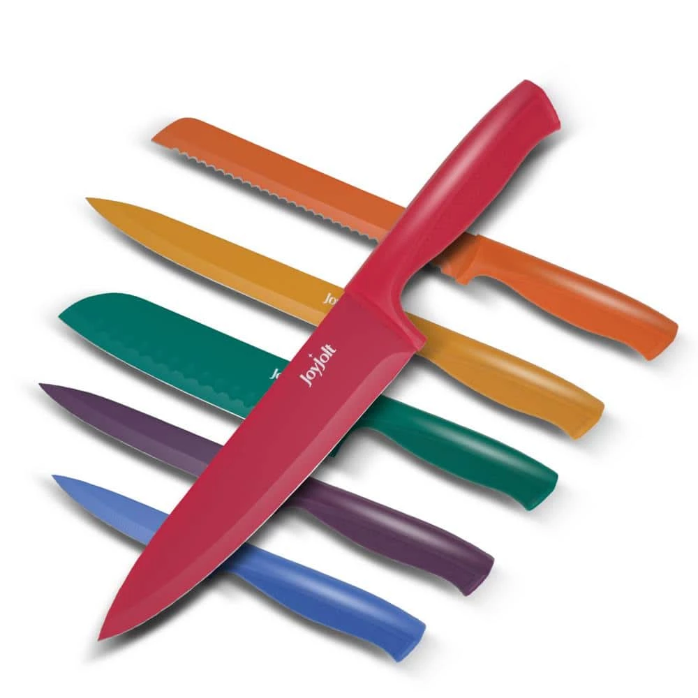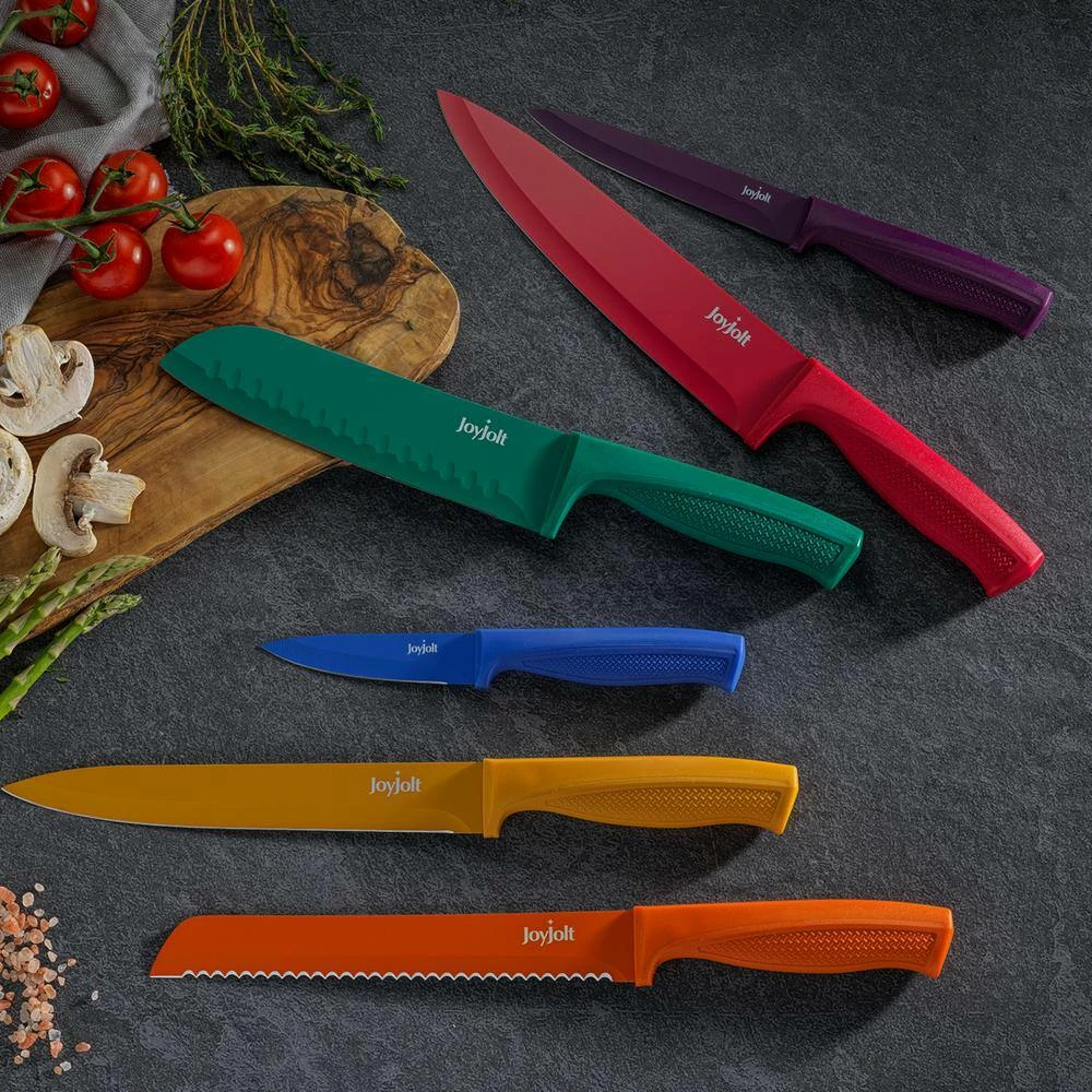 Slice Sashimi So Perfect You’ll Surprise Yourself. If you’re looking for a sharp tomato knife that doesn’t spill juice everywhere, a brisket slicing knife that won’t hack your meat to pieces or a japanese chef knife that lets you mince, dice and slice with lightning speed precision, you can now do it all with this Culinary Knife Set from JoyJolt. Available as a black knive set or a colored cooking knife set, there’s a razor SHARP knife set to match your kitchen as well as your dish. Cooking Knives Include: 8 in. Brisket Knife, 3.5 in. Fruit Knife / Vegetable Knife, 8 in. Chef’s Knife, 8 in. Bread Knife, Santuko Knife 7 in. and 5 in. utility knife Kitchen Knife. And each knife comes with its own knife cover.