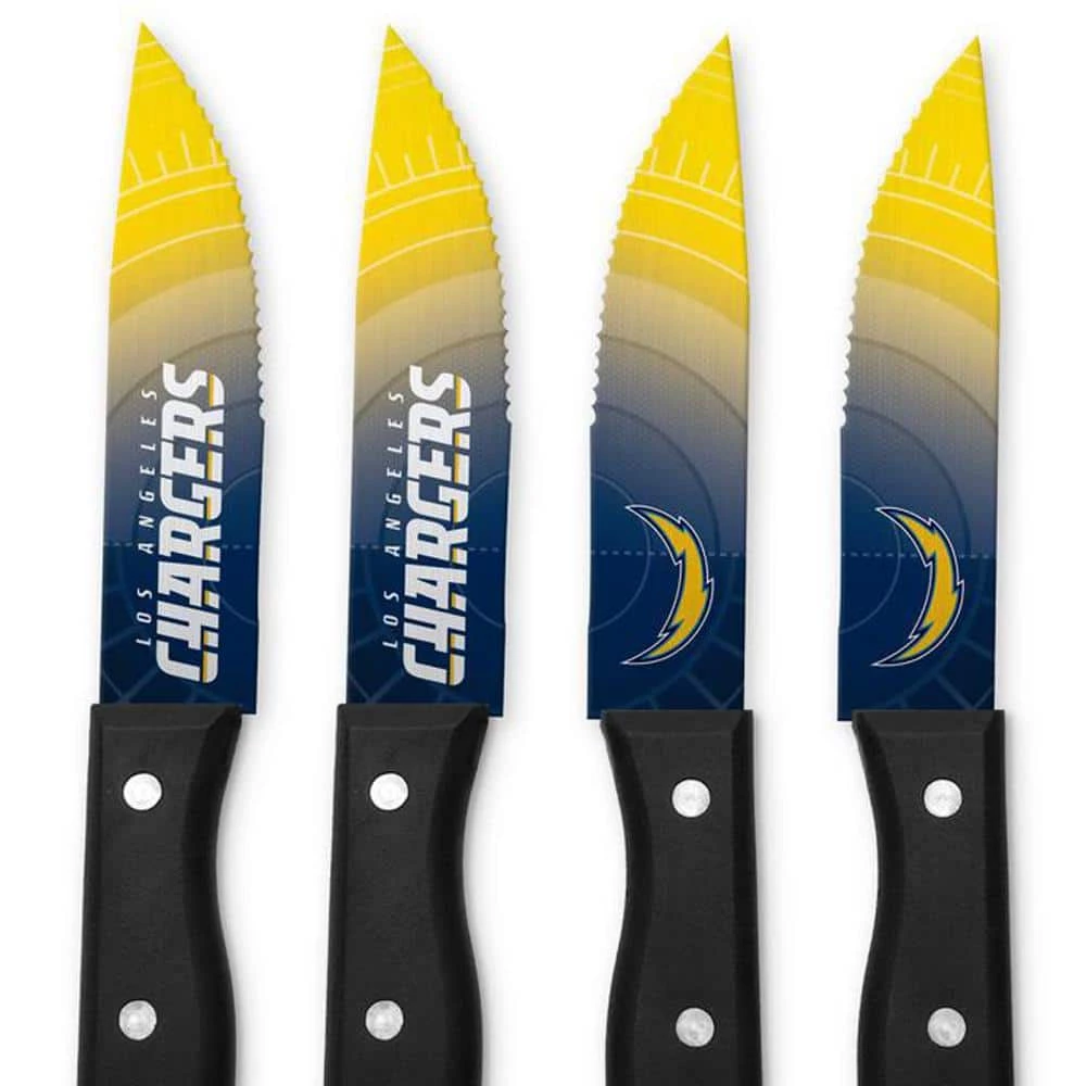 Looking for a new item to take your tailgate to the next level, Add this 4-piece stainless steel, steakhouse quality knife set to your collection of game day utensils. And show your buddies that your fandom is undeniable. Includes 4 steakhouse quality steak knives sure to enrich your favorite cut of meat.