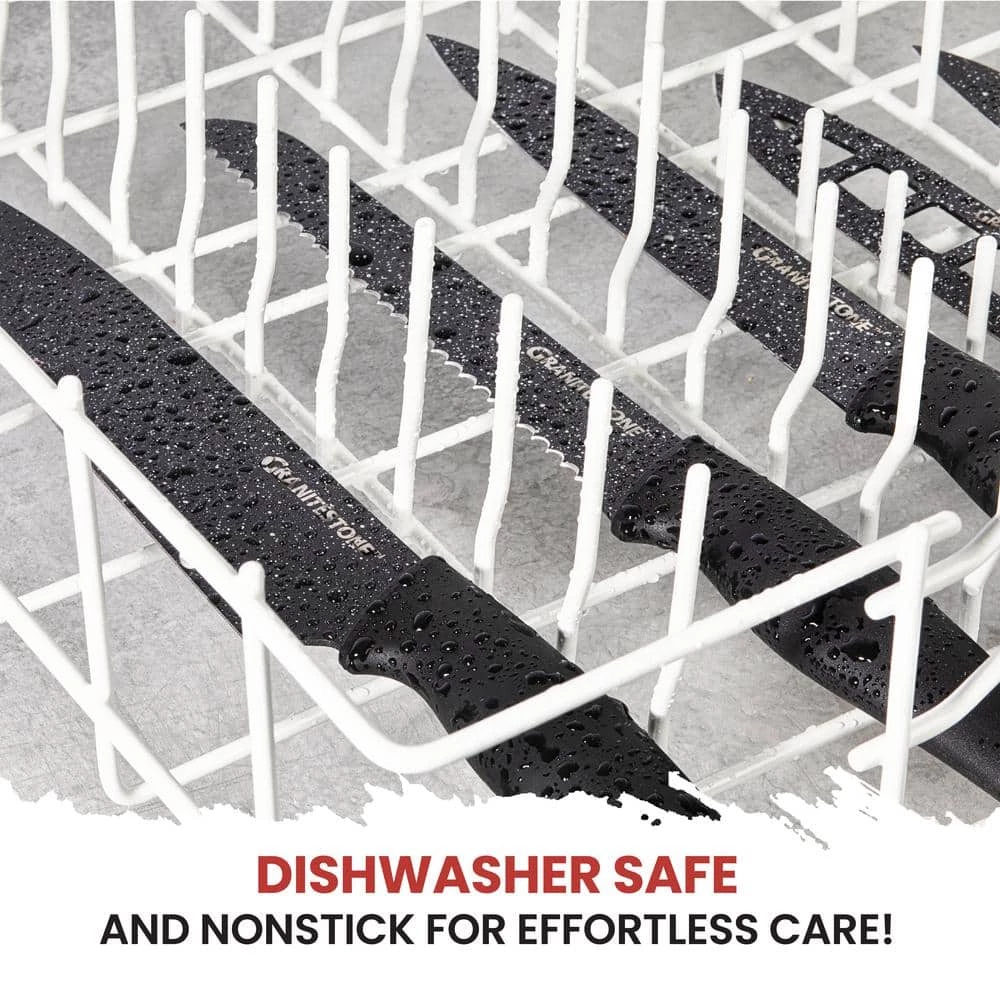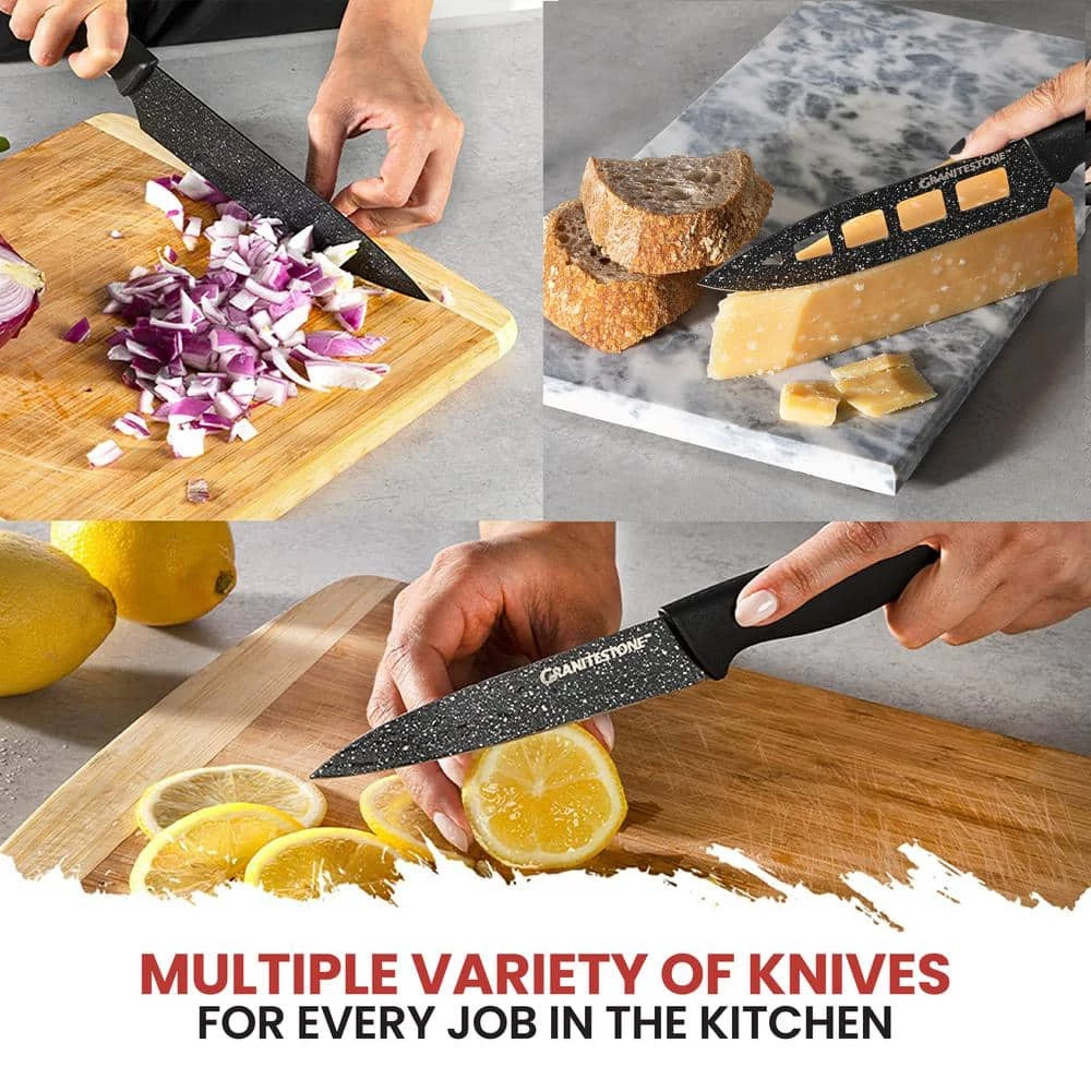 The 12-piece non-stick blade surface Nutri Blade Knives by Granite Stone is the perfect go-to cutlery knife set for your kitchen. This uniquely crafted knife set with granite coating gives the ability to slide through everything with ease. So you can chop, slice and dice like a Pro.
