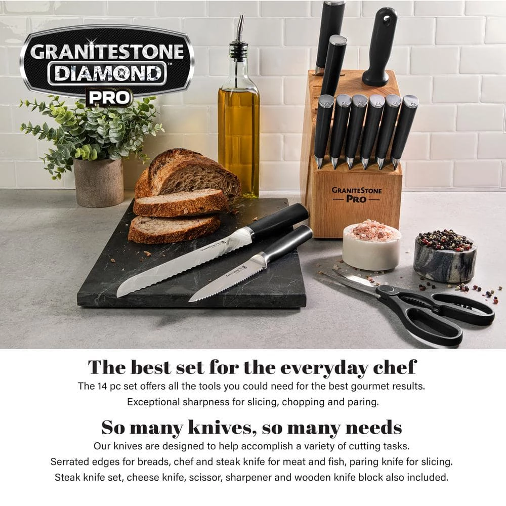 - Granitestone pro 14-piece set- the all in one 14-piece plus block set is made with pro-grade high-carbon stainless-steel and feature handles of ABS material which will never splinter or corrode for ultimate comfort and durability perfect for professional or home chefs
