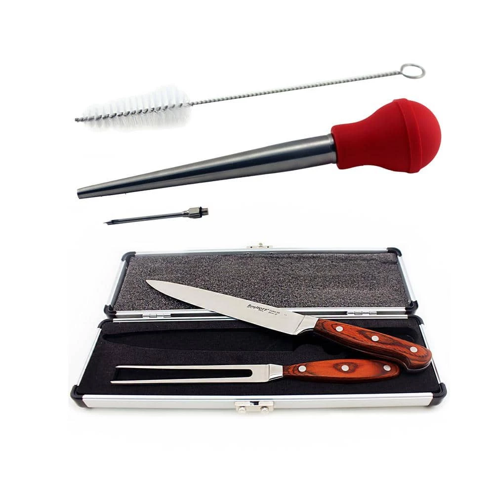 Pakka’s 3-piece Carving set has triple-riveted wood handle ensures superior balance and comfort. The carving-style blade makes cutting meat and poultry effortless. Forged of high-carbon stainless steel. This quality baster by BergHOFF was crafted from surgical-grade stainless steel for long-lasting use. The all-in-one set comes with a cleaning brush for those hard to reach spots and a bulb that removes easily, making clean up a breeze. Use the stainless needle for tenderizing and adding flavor to meats and poultry or the bulb applicator for maintaining moisture in your meals. Ideal for roasting, barbequing or smoking cooking methods. Set includes: 6 in. carving fork and 8 in. carving knife, plus a 14 in. x 4 in. aluminum storage case, 1-baster, 1-baster cleaning brush, 1-injector.