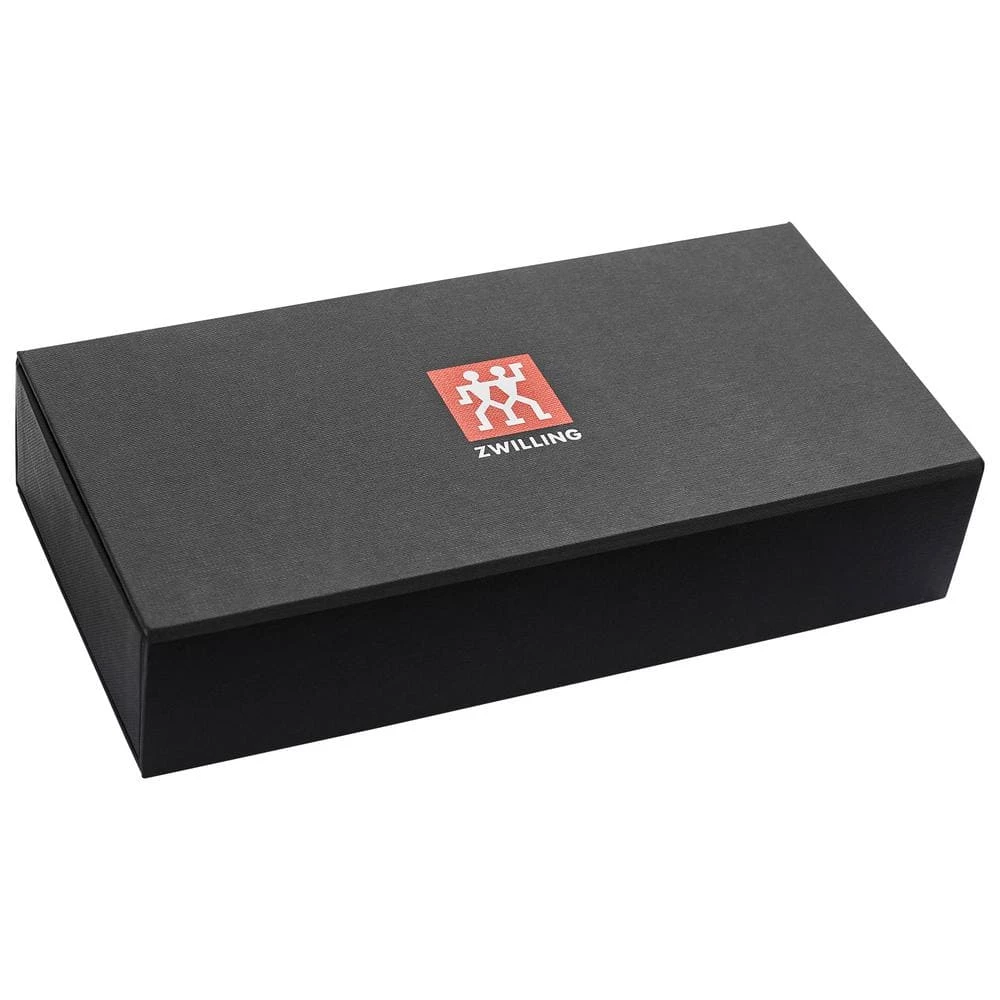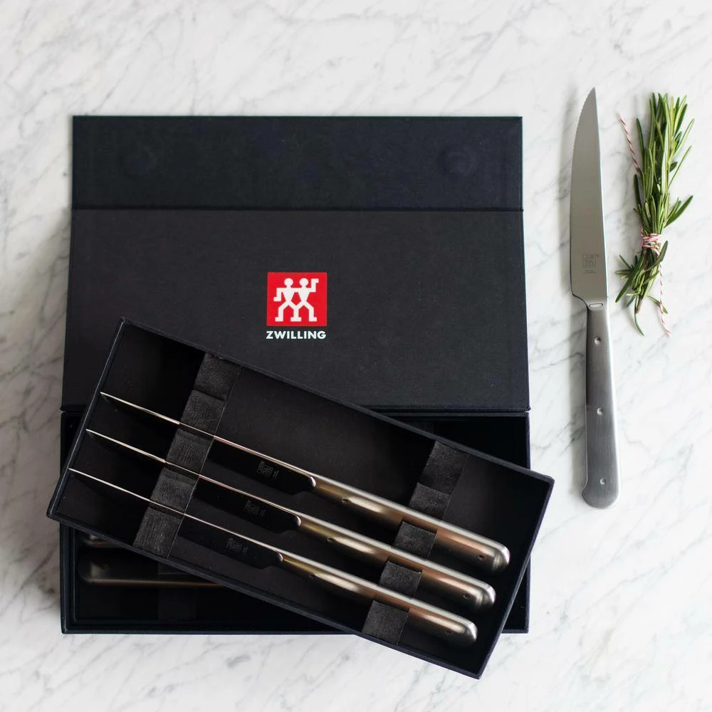 This set contains eight 4.5-inch steak knives packaged in an attractive black presentation box that is perfect for gift giving as well as storage. Precision-forged from a single piece of stainless steel, these strong blades boast long-lasting sharpness. From porterhouse to tri-tip, these durable knives effortlessly slice through even the thickest cuts of meat.