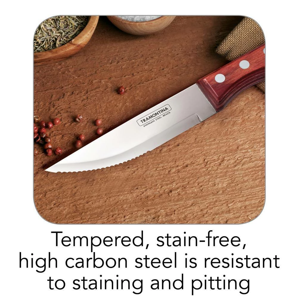 Tramontina’s Porterhouse Stainless Steel 5-Piece Steak Knife Set with Hardwood Counter Block delivers exceptional sharpness and quality construction. The high carbon stainless steel serrated blades with a pointed tip provides effortless cutting for steak and chops. These Gaucho style knives have dishwasher-safe Polywood handles for easy clean up. Made in Brazil, assembled in the U.S and offered under 25-year limited warranty.