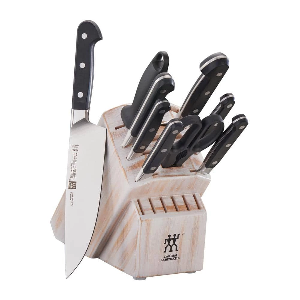 Set includes 3″ Paring Knife, 4″ Paring Knife, 5″ Serrated Utility Knife, 5.5″ Prep Knife, 7″ Santoku Knife, 8″ Bread Knife, 8″ Chef’s Knife, TWIN Shears, TWIN Sharpening Steel, and 16 Slot Hardwood Block.