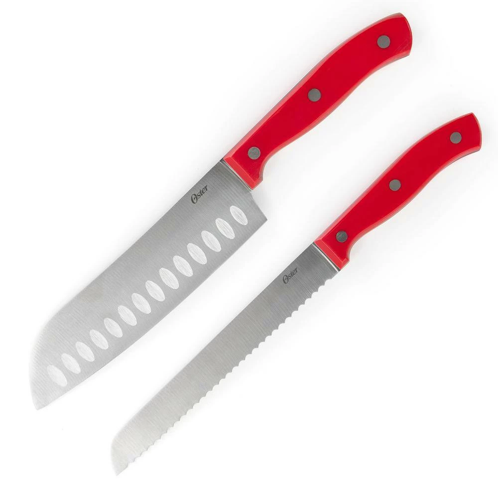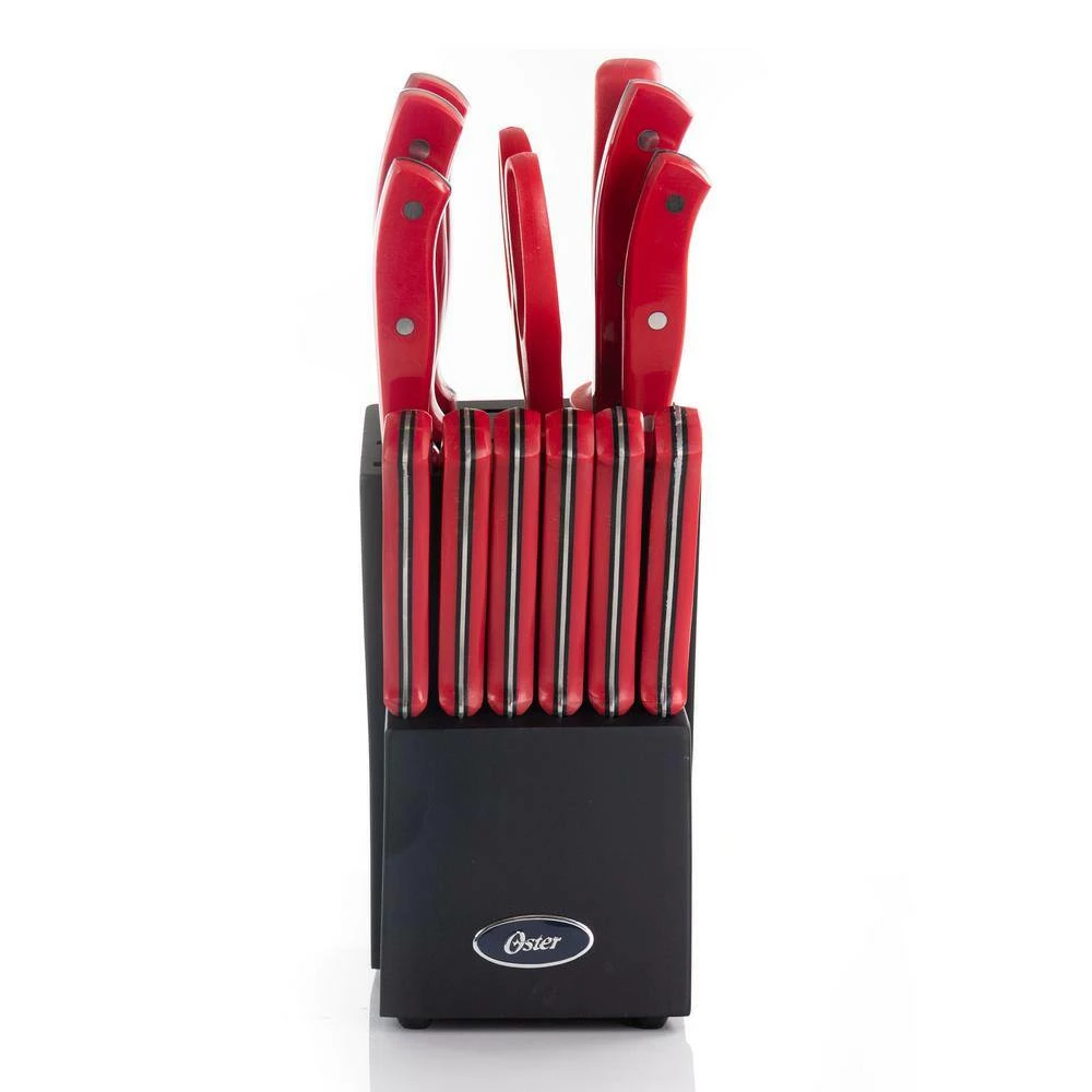 Amp up your kitchen setup with the Oster Steffen 14 Piece Stainless Steel Cutlery Set in Red with Hardwood Storage Block. The extravagant red handles and storage block beautify the kitchen counter space. Set includes all the necessary stainless steel cutlery to meet all your slicing and dicing needs. Cut fruit, carve meat, slice bread, and chop veggies to create the perfect meal for everyone to enjoy!