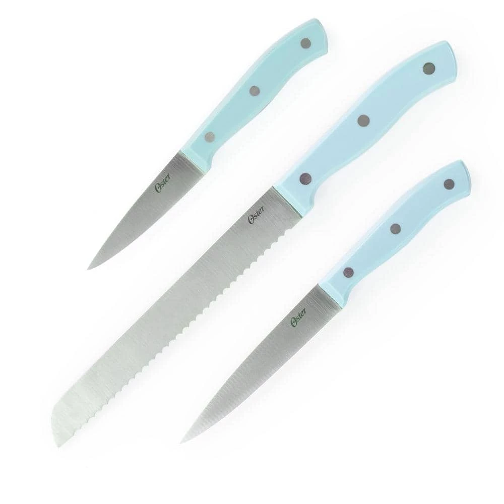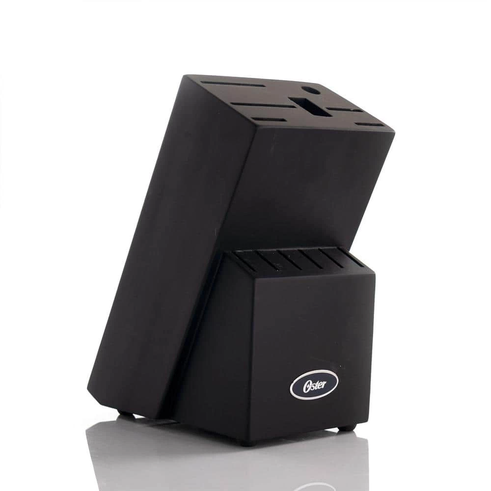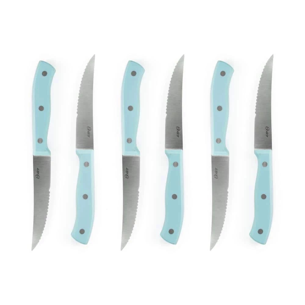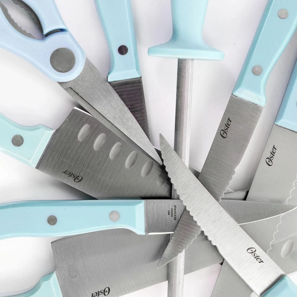 Add a touch of color and full form functionality with the Oster Steffen 14 Piece Stainless Steel Cutlery Set with Storage Block in Blue. This complete knife set comes with One 8″ Chef Knife, One 7″ Santoku Knife, One 8″ Bread Knife, One 5″ Utility Knife, One 3.5″ Paring Knife, One Sharpening Steel, One Pair of Kitchen Scissors, Six 4.5″ Steak Knives, and One Hardwood Storage Block. Each knife is crafted from durable stainless steel with precision stamped construction which maintains a sharp knife and ensures easy cutting of all types of food. Each knife is also equipped with an ergonoic, triple-riveted handle which secures the full tang blade. Each tool is stored in a stylish hardwood block for safe-keeping.