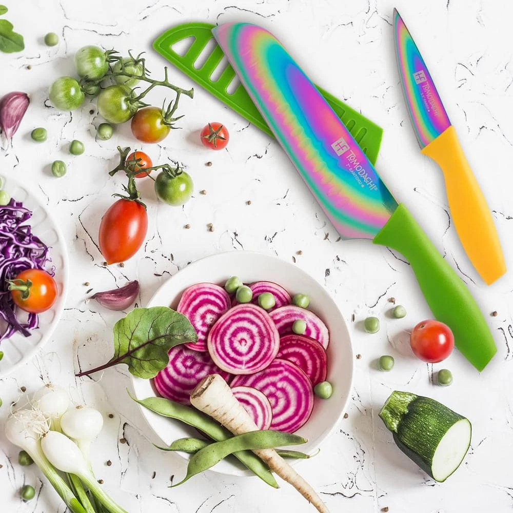 Not your ordinary prep set! For a fresh slice of life, brighten up and add some fun to your food prep experience with the Tomodachi Titanium 10 Piece Cutlery Set. Its rainbow, Titanium-plated blades are ultra trendy-combined with its superior sharpness makes for a fun and functional addition to your prep scene.? As an added bonus our set comes with matching sheaths for safe-keeping.