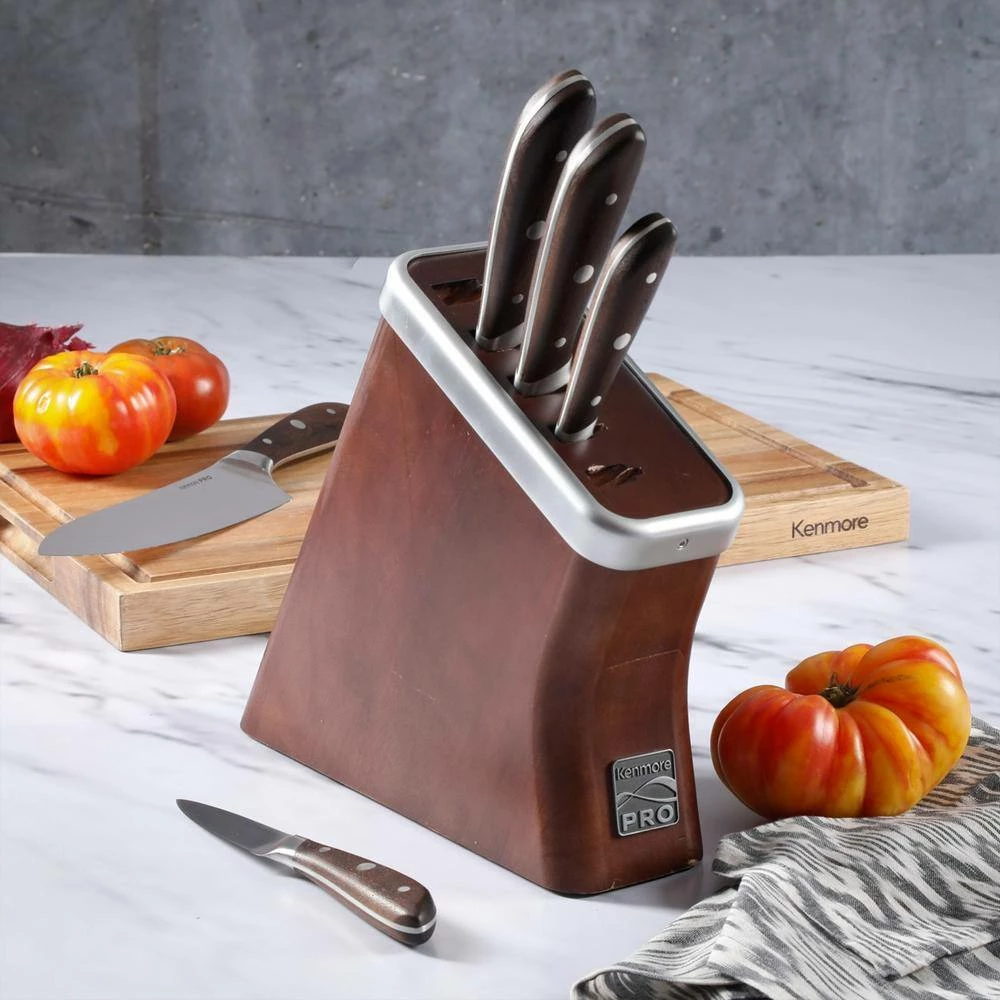 Enhance your kitchen’s knife collection with the Kenmore Pro Truman High Carbon Stainless Steel 6 Piece Cutlery Set With Wood Handles. The brown wood handles on this tool set gives you a firm and comfortable grip on the knife making them ideal for all your, cutting, chopping and mincing needs. All blades in this handy collection are composed of stainless steel and are expertly crafted for everyday use. Store it all in the handy storage block, keeping your countertop well organized and your blades safely protected. Make sure all your slicing and dicing needs are met as you prep onions, potatoes, fruits, meat, and other ingredients.