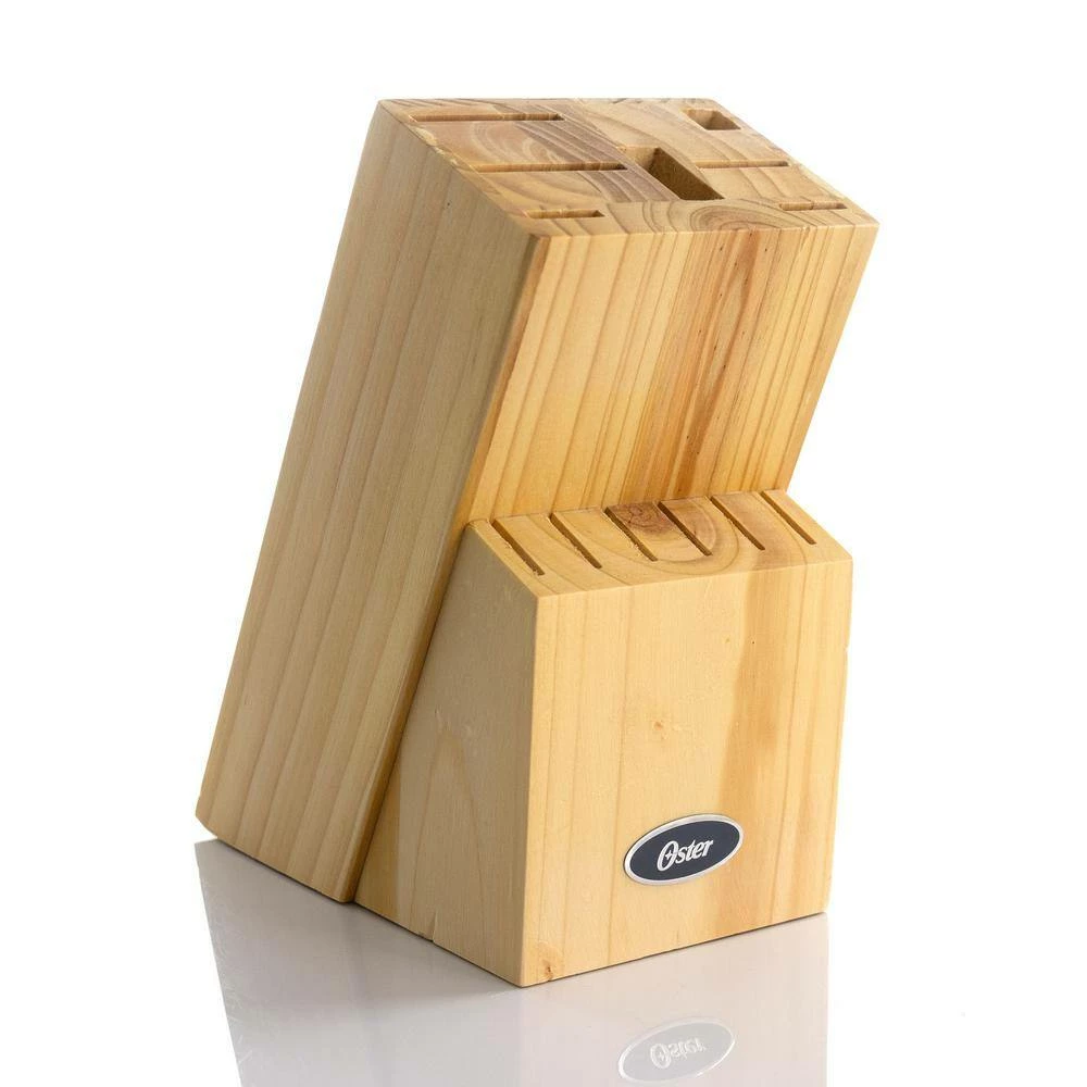 - Set includes: one 8 in. chef knife, one 8 in. bread knife, one 8 in. slicer knife, one 5 in. utility knife, one 3.5 in. paring knife, six 4.5 in. steak knives, 1-sharpener, 1-pine wood block, 1-pair kitchen scissors, 1-serving spoon, slotted spoon, turner, slotted turner, 1-grater, 1-ice cream scoop, one peeler, one can opener, 1-ceramic crock