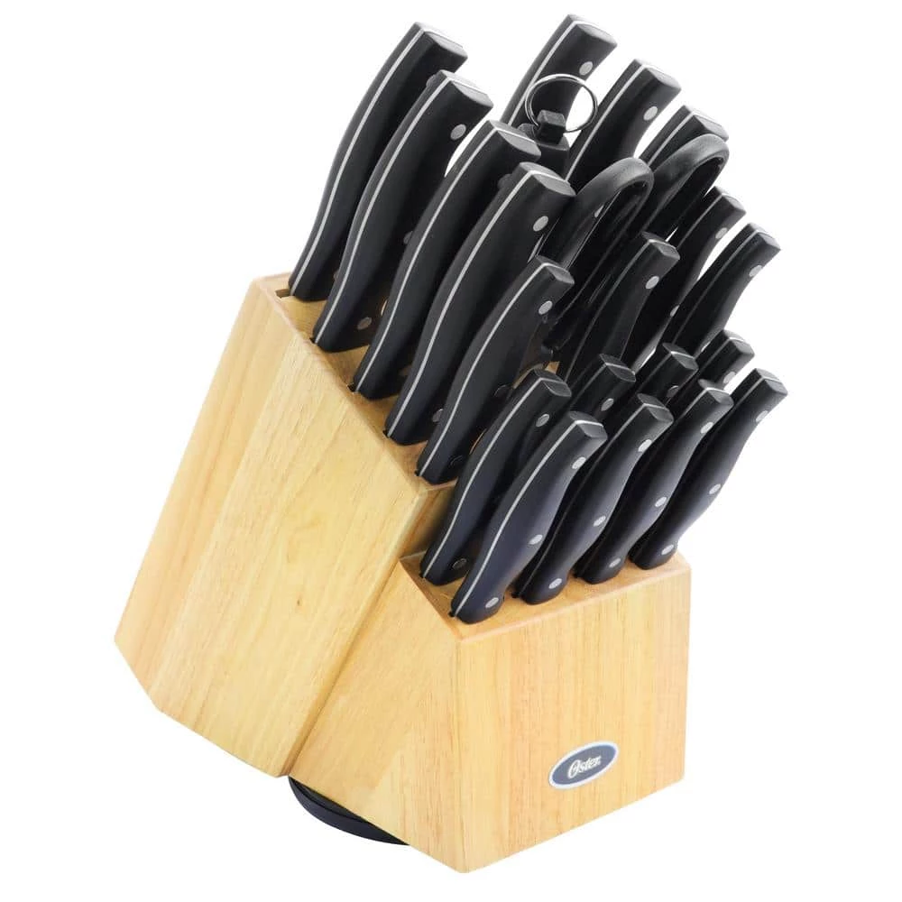 Complete your kitchen with this Winstead 22 piece Stainless Steel Cutlery Block Set. Each blade of the knives are precision-stamped for durability through the full length of the knife. This Oster knife set also features high-quality, stain- and rust-resistant stainless steel blades to last you throughout the years. Store all your knives in the swivel Rubberwood Block for convenience and safety.